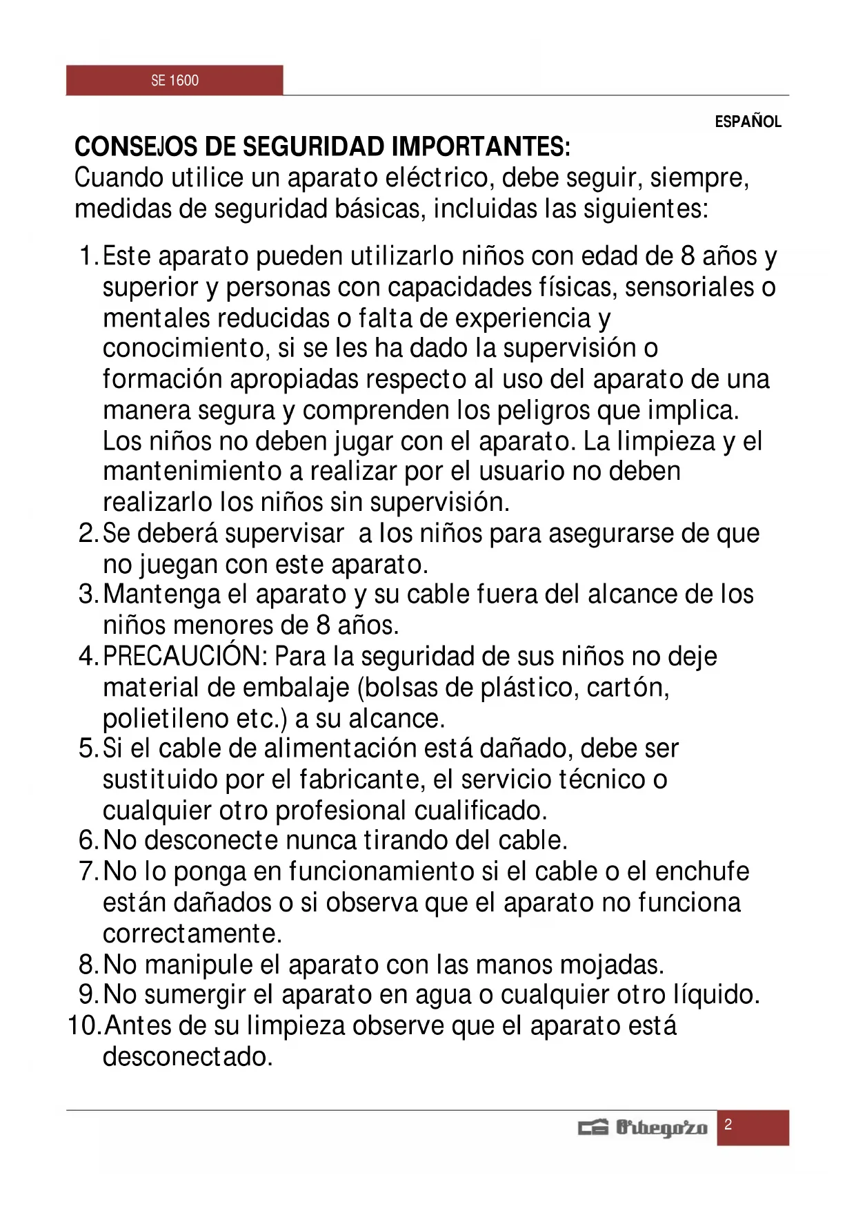 MANUAL DE USUARIO SE 1600 Orbegozo