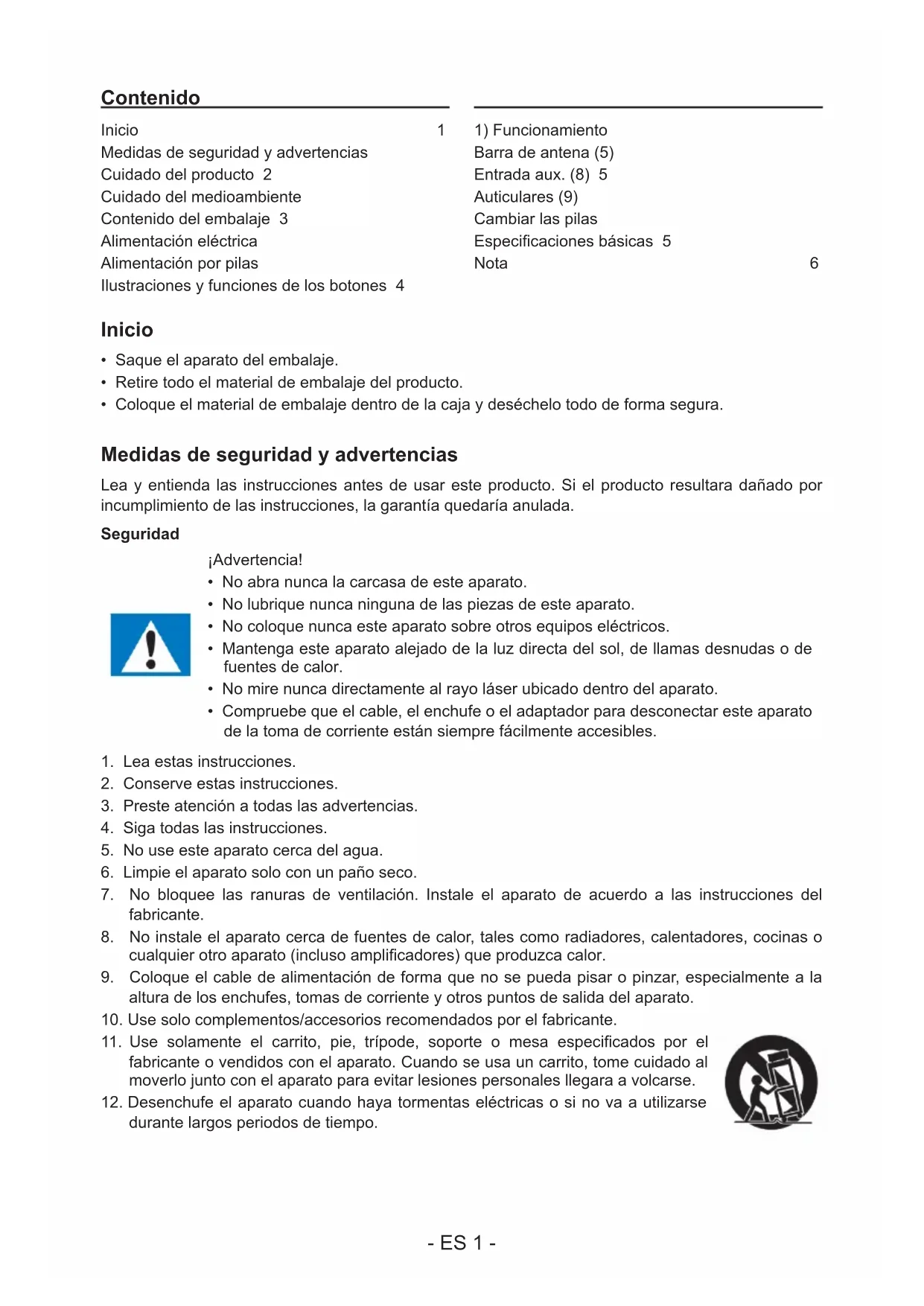 LE ROGAMOS QUE LEA ÍNTEGRAMENTE EL PRESENTE MANUAL DEL USUARIO ANTES DE UTILIZAR EL EQUIPO Y QUE CONSERVE ESTE FOLLETO PARA PODER CONSULTARLO EN EL FUTURO. ES- ES 1 - Contenido Inicio 1 Medidas de seguridad y advertencias Cuidado del producto 2 Cuidado del medioambiente Contenido del embalaje 3 Alimentación eléctrica Alimentación por pilas Ilustraciones y funciones de los botones 4