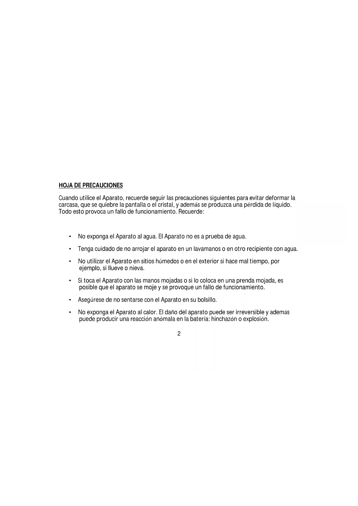 - No exponga el Aparato al calor. El daño del aparato puede ser irreversible y además puede producir una reacción anómala en la batería: hinchazón o explosión.3