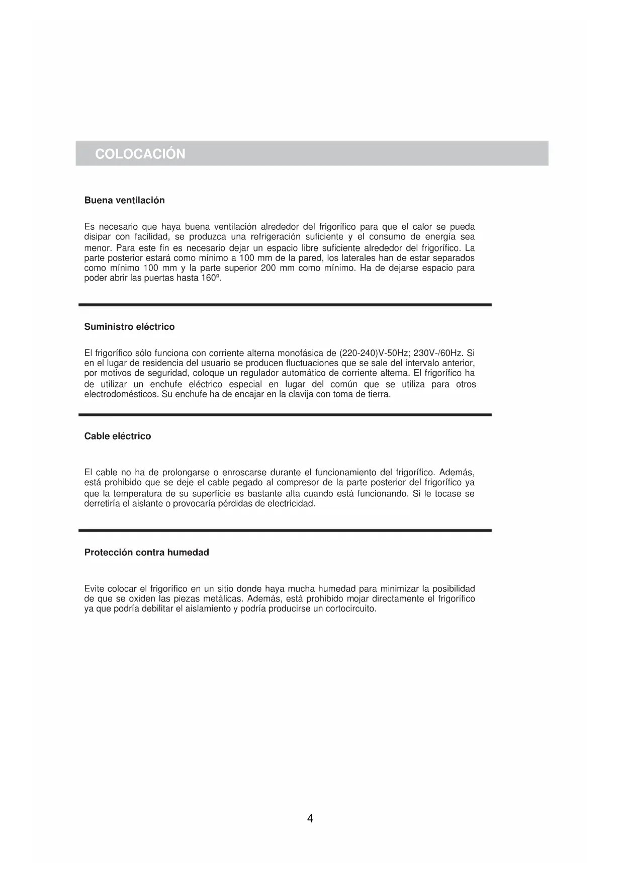 El cable no ha de prolongarse o enroscarse durante el funcionamiento del frigorífico. Además, está prohibido que se deje el cable pegado al compresor de la parte posterior del frigorífico ya que la temperatura de su superficie es bastante alta cuando está funcionando. Si le tocase se derretiría el aislante o provocaría pérdidas de electricidad.