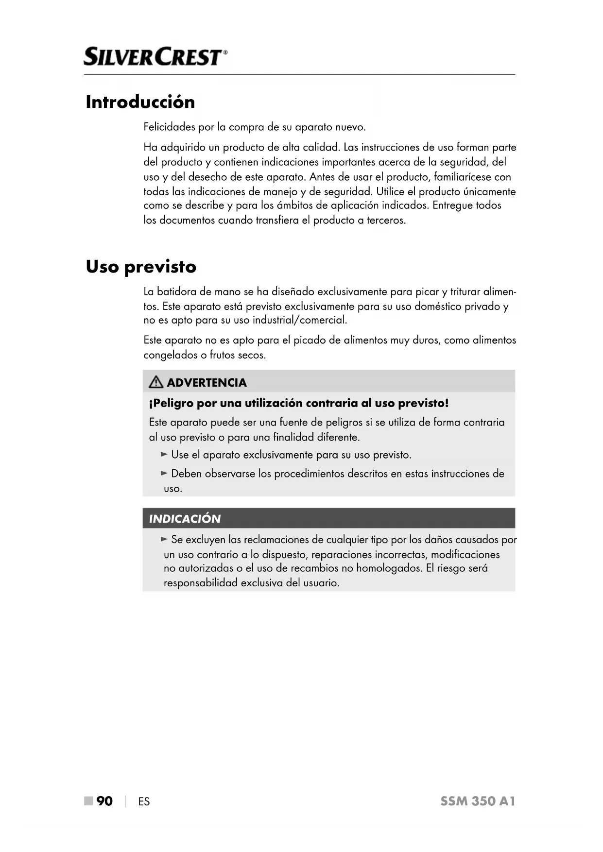 ES SSM 350 A1 Introducción Felicidades por la compra de su aparato nuevo. Ha adquirido un producto de alta calidad. Las instrucciones de uso forman parte del producto y contienen indicaciones importantes acerca de la seguridad, del uso y del desecho de este aparato. Antes de usar el producto, familiarícese con todas las indicaciones de manejo y de seguridad. Utilice el producto únicamente como se describe y para los ámbitos de aplicación indicados. Entregue todos los documentos cuando transfiera el producto a terceros. Uso previsto La batidora de mano se ha diseñado exclusivamente para picar y triturar alimen- tos. Este aparato está previsto exclusivamente para su uso doméstico privado y no es apto para su uso industrial/comercial. Este aparato no es apto para el picado de alimentos muy duros, como alimentos congelados o frutos secos. ADVERTENCIA ¡Peligro por una utilización contraria al uso previsto! Este aparato puede ser una fuente de peligros si se utiliza de forma contraria al uso previsto o para una finalidad diferente. ► Use el aparato exclusivamente para su uso previsto. ► Deben observarse los procedimientos descritos en estas instrucciones de uso. INDICACIÓN ► Se excluyen las reclamaciones de cualquier tipo por los daños causados por un uso contrario a lo dispuesto, reparaciones incorrectas, modificaciones no autorizadas o el uso de recambios no homologados. El riesgo será responsabilidad exclusiva del usuario.ES
