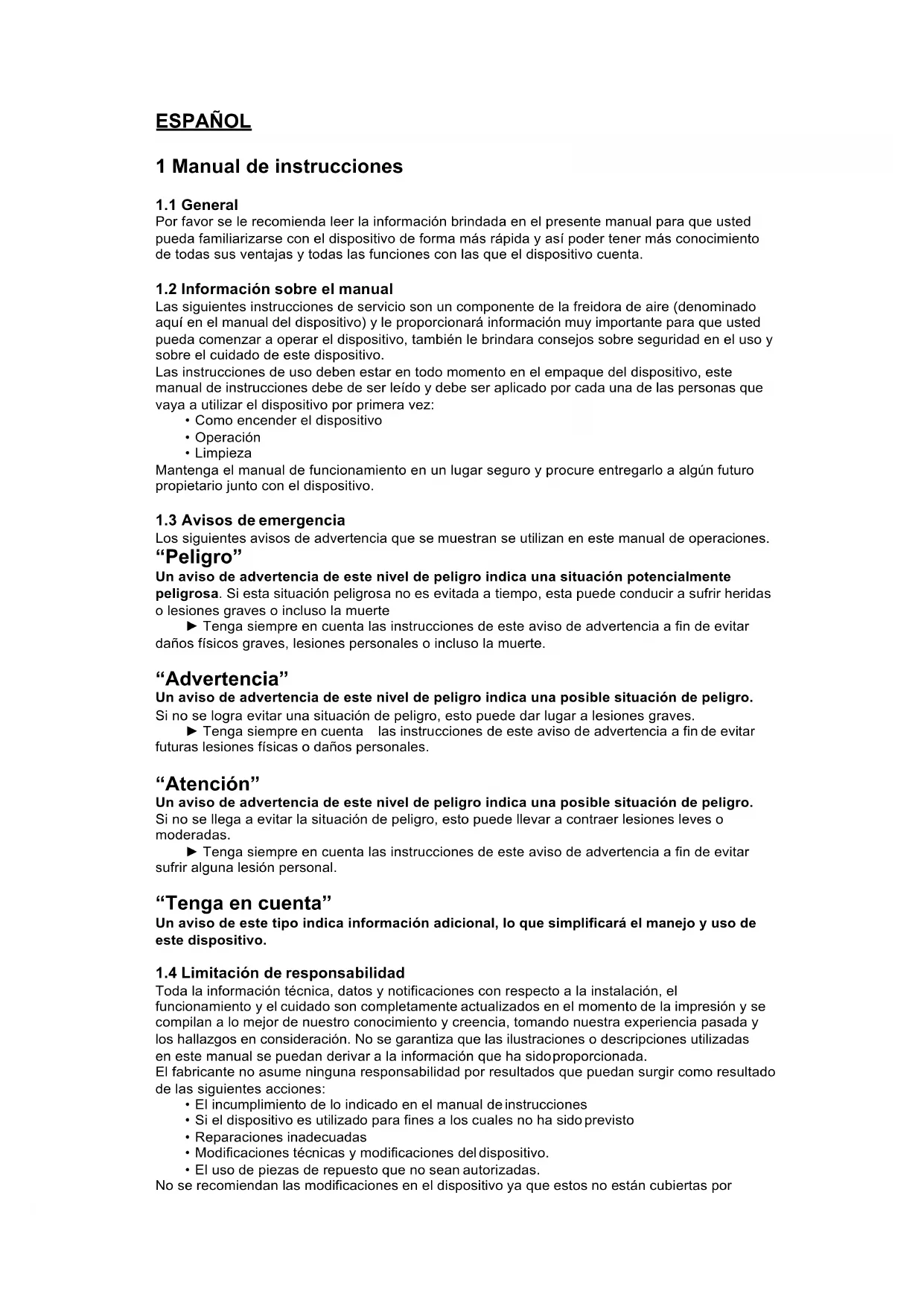 En caso de un mal uso o incumplimiento de las instrucciones o el uso inadecuado del dispositivo, el fabricante no asume ninguna responsabilidad y la garantía será nula.