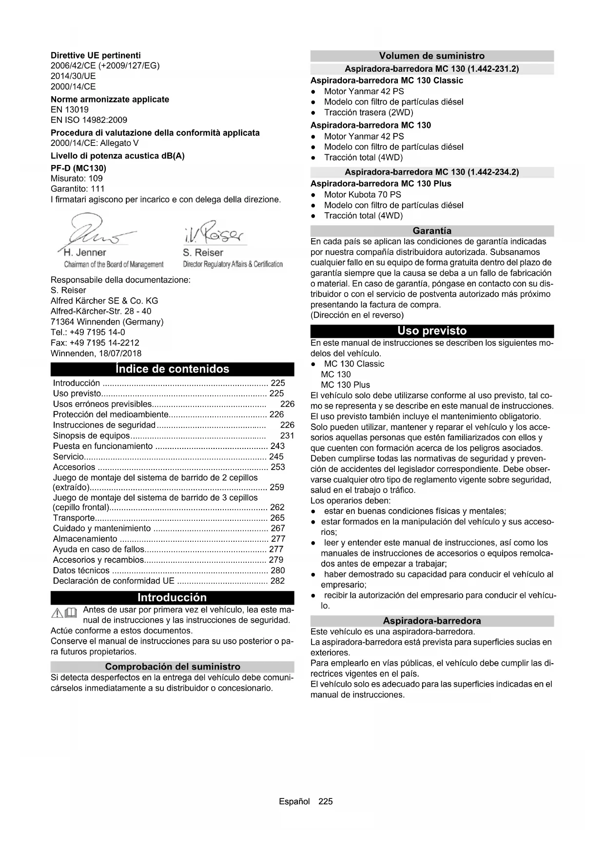 - dell’aria (bar) con 40 km/h 1,3 1,5 1,8 2,0 2,5 2,9 Deestone D408 26x12-12.00 - 12 10 PLY Pneumatici da trazioneEspañol 225 Direttive UE pertinenti 2006/42/CE (+2009/127/EG) 2014/30/UE 2000/14/CE Norme armonizzate applicate EN 13019 EN ISO 14982:2009 Procedura di valutazione della conformità applicata 2000/14/CE: Allegato V Livello di potenza acustica dB(A) PF-D (MC130) Misurato: 109 Garantito: 111 I firmatari agiscono per incarico e con delega della direzione. Responsabile della documentazione: S. Reiser Alfred Kärcher SE & Co. KG Alfred-Kärcher-Str. 28 - 40 71364 Winnenden (Germany) Tel.: +49 7195 14-0 Fax: +49 7195 14-2212 Winnenden, 18/07/2018 Índice de contenidos Introducción Antes de usar por primera vez el vehículo, lea este ma- nual de instrucciones y las instrucciones de seguridad. Actúe conforme a estos documentos. Conserve el manual de instrucciones para su uso posterior o pa- ra futuros propietarios. Comprobación del suministro Si detecta desperfectos en la entrega del vehículo debe comuni- cárselos inmediatamente a su distribuidor o concesionario. Volumen de suministro Aspiradora-barredora MC 130 (1.442-231.2) Aspiradora-barredora MC 130 Classic ● Motor Yanmar 42 PS ● Modelo con filtro de partículas diésel ● Tracción trasera (2WD) Aspiradora-barredora MC 130 ● Motor Yanmar 42 PS ● Modelo con filtro de partículas diésel ● Tracción total (4WD) Aspiradora-barredora MC 130 (1.442-234.2) Aspiradora-barredora MC 130 Plus ● Motor Kubota 70 PS ● Modelo con filtro de partículas diésel ● Tracción total (4WD) Garantía En cada país se aplican las condiciones de garantía indicadas por nuestra compañía distribuidora autorizada. Subsanamos cualquier fallo en su equipo de forma gratuita dentro del plazo de garantía siempre que la causa se deba a un fallo de fabricación o material. En caso de garantía, póngase en contacto con su dis- tribuidor o con el servicio de postventa autorizado más próximo presentando la factura de compra. (Dirección en el reverso) Uso previsto En este manual de instrucciones se describen los siguientes mo- delos del vehículo. ● MC 130 Classic MC 130 MC 130 Plus El vehículo solo debe utilizarse conforme al uso previsto, tal co- mo se representa y se describe en este manual de instrucciones. El uso previsto también incluye el mantenimiento obligatorio. Solo pueden utilizar, mantener y reparar el vehículo y los acce- sorios aquellas personas que estén familiarizados con ellos y que cuenten con formación acerca de los peligros asociados. Deben cumplirse todas las normativas de seguridad y preven- ción de accidentes del legislador correspondiente. Debe obser- varse cualquier otro tipo de reglamento vigente sobre seguridad, salud en el trabajo o tráfico. Los operarios deben: ● estar en buenas condiciones físicas y mentales; ● estar formados en la manipulación del vehículo y sus acceso- rios; ● leer y entender este manual de instrucciones, así como los manuales de instrucciones de accesorios o equipos remolca- dos antes de empezar a trabajar; ● haber demostrado su capacidad para conducir el vehículo al empresario; ● recibir la autorización del empresario para conducir el vehícu- lo. Aspiradora-barredora Este vehículo es una aspiradora-barredora. La aspiradora-barredora está prevista para superficies sucias en exteriores. Para emplearlo en vías públicas, el vehículo debe cumplir las di- rectrices vigentes en el país. El vehículo solo es adecuado para las superficies indicadas en el manual de instrucciones. Introducción p. 225