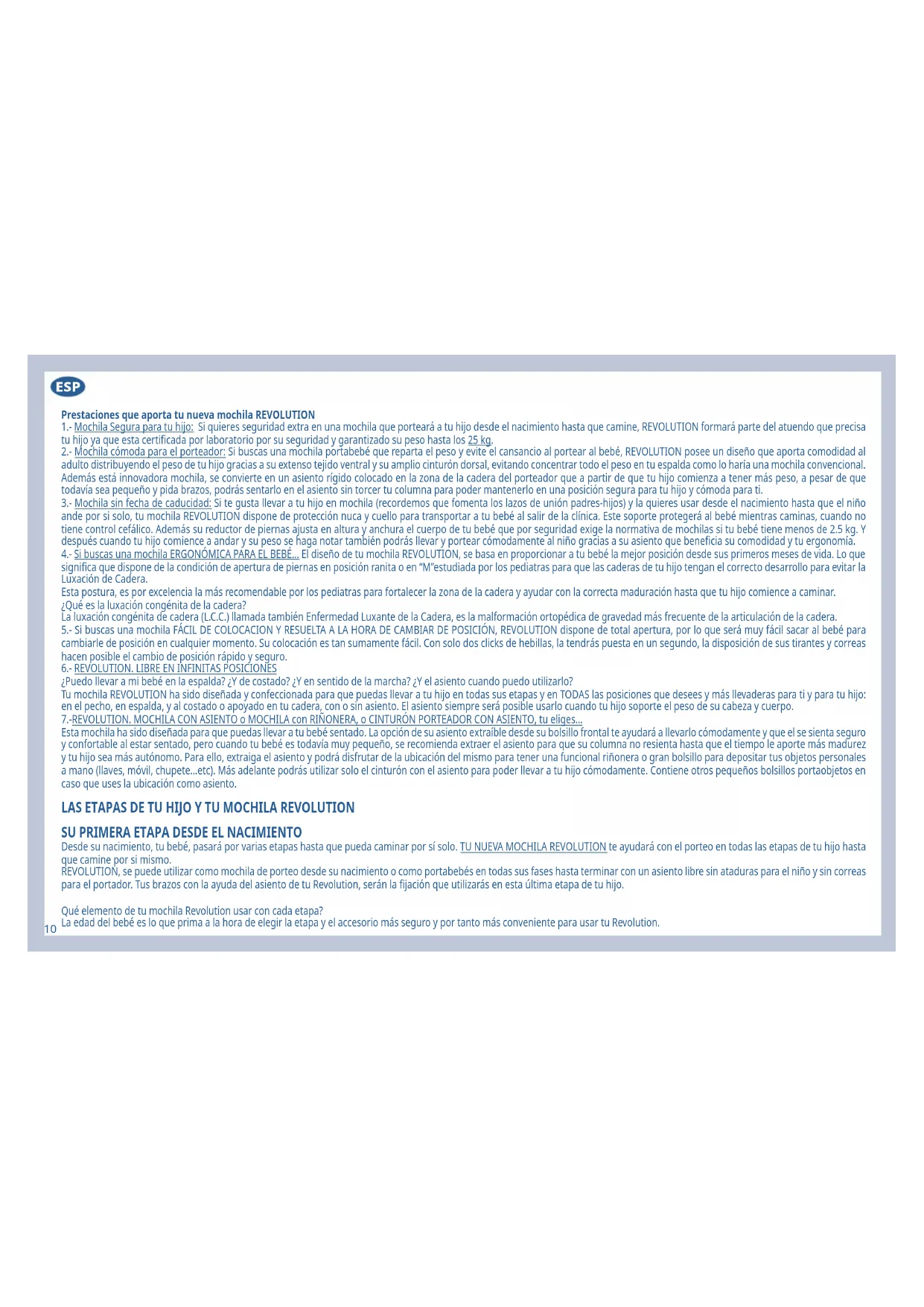 Desde su nacimiento, tu bebé, pasará por varias etapas hasta que pueda caminar por sí solo. TU NUEVA MOCHILA REVOLUTION te ayudará con el porteo en todas las etapas de tu hijo hasta que camine por si mismo. REVOLUTION, se puede utilizar como mochila de porteo desde su nacimiento o como portabebés en todas sus fases hasta terminar con un asiento libre sin ataduras para el niño y sin correas para el portador. Tus brazos con la ayuda del asiento de tu Revolution, serán la fijación que utilizarás en esta última etapa de tu hijo. Qué elemento de tu mochila Revolution usar con cada etapa? La edad del bebé es lo que prima a la hora de elegir la etapa y el accesorio más seguro y por tanto más conveniente para usar tu Revolution. ESP11 ESP Tu mochila REVOLUTION lleva un accesorio completamente innovador que es un asiento rígido incorporado en el cinturón dorsal frontal. Esta versión de mochila aportará a tu hijo un extra en comodidad por el apoyo de su culito y su espalda en un asiento que restará más relajada y equilibrada. Para ti también será beneficioso, ya que tu espalda y cintura, ya no tendrán que curvarse en ningún momento (que es la tendencia) al sentir el peso del niño en la cintura. Esta versión es segura para tu hijo a partir de los seis meses o bien que tu bebé aguante sentado su propio cuerpo sin caerse. +0 MESES.- POSICION FRONTAL CON REDUCTOR + PROTECTOR CERVICAL Y NUCA Cuando el bebé es recién nacido hasta que tiene 4 meses y medio aproximadamente, es conveniente el uso como mochila con la opción del reductor de piernas (Ver página 4 letra H del detalle de componentes) debido a que el bebé es muy pequeño y tanto su cuerpo como sus piernecitas deben quedar protegidas dentro de la mochila. El reductor de piernas evitará que el niño pueda caerse por alguna de las aberturas laterales a la vez que ayudará a proteger su cuerpo y el culito pueda quedar lo más adentro posible, y así quede bien sentado en el interior de tu mochila REVOLUTION. La primera etapa de tu bebé estará condicionada a una sola posición en el pecho (mirándote a ti de frente). Fortalecerá vuestros lazos a la vez que le proporcionarás la máxima protección y calor. En esta primera etapa los tirantes de tu REVOLUTION juegan un papel muy importante. Los tirantes pueden llevarse rectos en vertical o bien cruzados, pero siempre tu bebé deberá ir en posición frontal hasta que tenga completo control cefálico. A - CON TIRANTES VERTICALES PARALELOS A LOS BRAZOS DEL PORTEADOR Y SIN ASIENTO RÍGIDO CON REDUCTOR INTERIOR Para colocar al bebé en el reductor, observa los dibujos de sus componentes en la página 4 y sigue los pasos que se reflejan en los dibujos de la página 6 como apoyo: PASO 1. Separa el cuerpo de tu mochila a través de la cremallera y retira la opción de asiento que lleva tu mochila por defecto al adquirirlo en tu tienda, extráelo del bolsillo frontal y guárdalo en la caja con tus instrucciones para utilizarlo más adelante. Dobla el bolsillo por la mitad y cierra la cremallera del bolsillo que ha quedado al extraer el asiento. Cierra el botón para doblarlo completamente. Podrás hacer uso de éste para guardar tus objetos personales. PASO 2. Vuelve a unir el cuerpo de tu mochila al fajín o cinturón ventral esta vez por la cremallera que ha quedado en la parte superior. Después, ponte la mochila por la parte del cinturón y fíjalo en la cintura abrochando las hebillas. Tira de las correas para notar que el cinturón queda a la medida adecuada para ti. Escucha el clic de ajuste de la hebilla. Asegúrate que las hebillas estén bien cerradas y enrolla el sobrante de la correa en la goma elástica que queda en la punta, para que no cuelgue y puedas tropezar. Ahora une verticalmente las correas y ajusta los tirantes (pág. 4 A) con las hebillas de cierre (pág. 4 B).Comprueba que están paralelas a tus brazos. PASO 3. Saca el reductor de pierna de tu REVOLUTION (ver página 4 M) fuera del bolsillo interior donde está guardado y estira de él hacia ti para que salga. PASO 4. Desabrocha los botones de la solapa o protector de nuca que quedaba unida a la parte frontal superior de tu mochila (página 4 J). Sube la solapa y fíjala a cada botón lateral de los tirantes que quedan en cada uno de tus hombros. Los botones que han quedado libres más abajo serán ahora los de fijación de tu reductor de piernas. PASO 5. Toma a tu bebé en brazos y siéntate. Extiende tu mochila y tumba a tu bebé boca arriba como si fueras a cambiarle el pañal. Luego estira del reductor y pásalo por entremedio de sus piernas. Ajusta el reductor llevando el ojal a los botones de la parte delantera que han quedado libres. El reductor evitará que pueda colarse tras la abertura de piernas de tu mochila cuando tu bebé es muy pequeño. Asegúrate que estos botones están bien cerrados y apretados. A medida que tu bebé vaya creciendo verás que no necesitarás utilizar el reductor. Pasará poco a poco a asomar su pie, después la piernecilla hasta llegar a su rodilla. Ese será el momento de olvidarnos del reductor y guardarlo en la bolsa interna que lleva en el interior tu mochila Revolution. PASO 6. Introduce el brazo por uno de los tirantes mientras sujetas al niño contra tu pecho con la otra mano. Cambia ahora de mano y colócate el segundo tirante sin dejar de apretar a tu hijo contra tu pecho. PASO 7. Finalmente cierra la hebilla de unión en la espalda para que los tirantes no se resbalen de los hombros y queden perfectamente equilibrados. Comprueba que tus hombros están a la misma altura y que las correas centrales no quedan pegadas a tu cuello, sino en mitad de tu espalda, justo en la parte baja de tus omoplatos. Ajusta las correas tanto en altura como en anchura tirando de ellas. Siente la comodidad de tu mochila y la protección que le da a tu hijo. Ten especial cuidado que ninguna de las extremidades de tu hijo queden atrapadas entre el cinturón abdominal y tu cintura,
