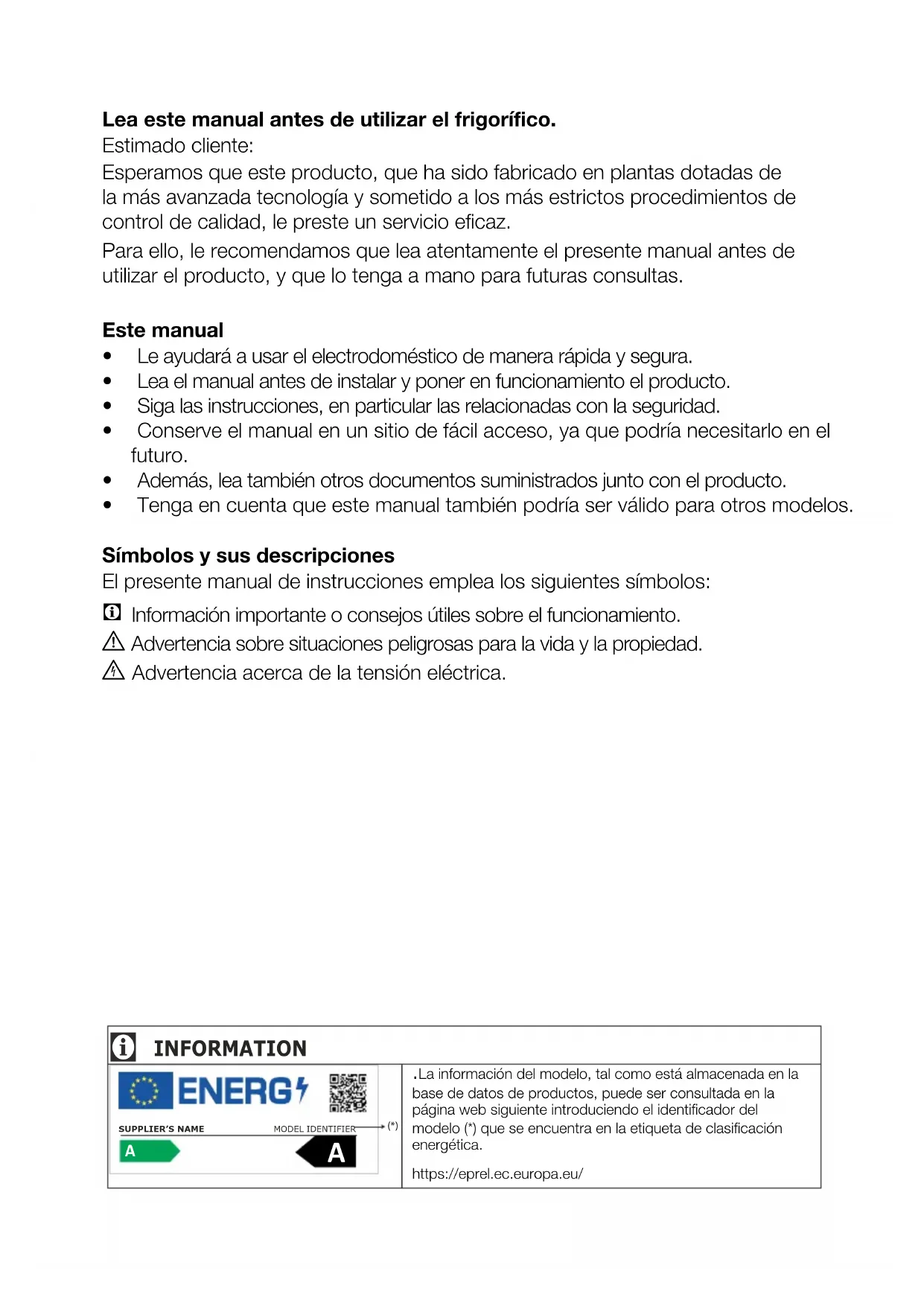 sustancias inflamables o explosivas. t No utilice dispositivos mecánicos u otros medios para acelerar el proceso de deshielo distintos de los recomendados por el fabricante. t Este aparato no debe ser utilizado por niños o por personas con sus facultades físicas, sensoriales o mentales reducidas o bien que carezcan de la experiencia y los conocimientos necesarios, a menos que lo hagan bajo la supervisión de personas responsables de su seguridad o bien tras haber recibido instrucciones de uso por parte de dichas personas. t No utilice un frigorífico que haya sufrido daños. Consulte con el servicio de atención al cliente en caso de duda. t La seguridad eléctrica de su frigorífico sólo estará garantizada si el sistema de toma de tierra de su domicilio se ajusta a los estándares. t Desde el punto de vista de la seguridad eléctrica, es peligroso exponer el aparato a la lluvia, la nieve o el viento. t Póngase en contacto con el servicio técnico autorizado en caso de que el cable de alimentación principal se dañe, para evitar cualquier peligro. t Nunca enchufe el frigorífico en la toma de corriente durante su instalación. Existe peligro de lesiones graves e incluso de muerte. t Este frigorífico está únicamente diseñado para almacenar alimentos. No debe utilizarse para ningún otro propósito. t La etiqueta que contiene los datos técnicos del frigorífico se encuentra en la parte interior izquierda del mismo. t Jamás conecte el frigorífico a sistemas de ahorro de electricidad, ya que podría dañarlo. t Si el frigorífico está equipado con una luz azul, no la mire a simple vista o a través de dispositivos ópticos durante un tiempo prolongado. t En los frigoríficos de control manual, si se produce un corte del fluido eléctrico espere al menos 5 minutos antes de volver a ponerlo en marcha. t Cuando entregue este aparato a un nuevo propietario, asegúrese de entregar también este manual de instrucciones. t Tenga cuidado de no dañar el cable de alimentación al transportar el frigorífico. Doblar el cable podría causar un incendio. Nunca deposite objetos pesados encima del cable de alimentación.ES