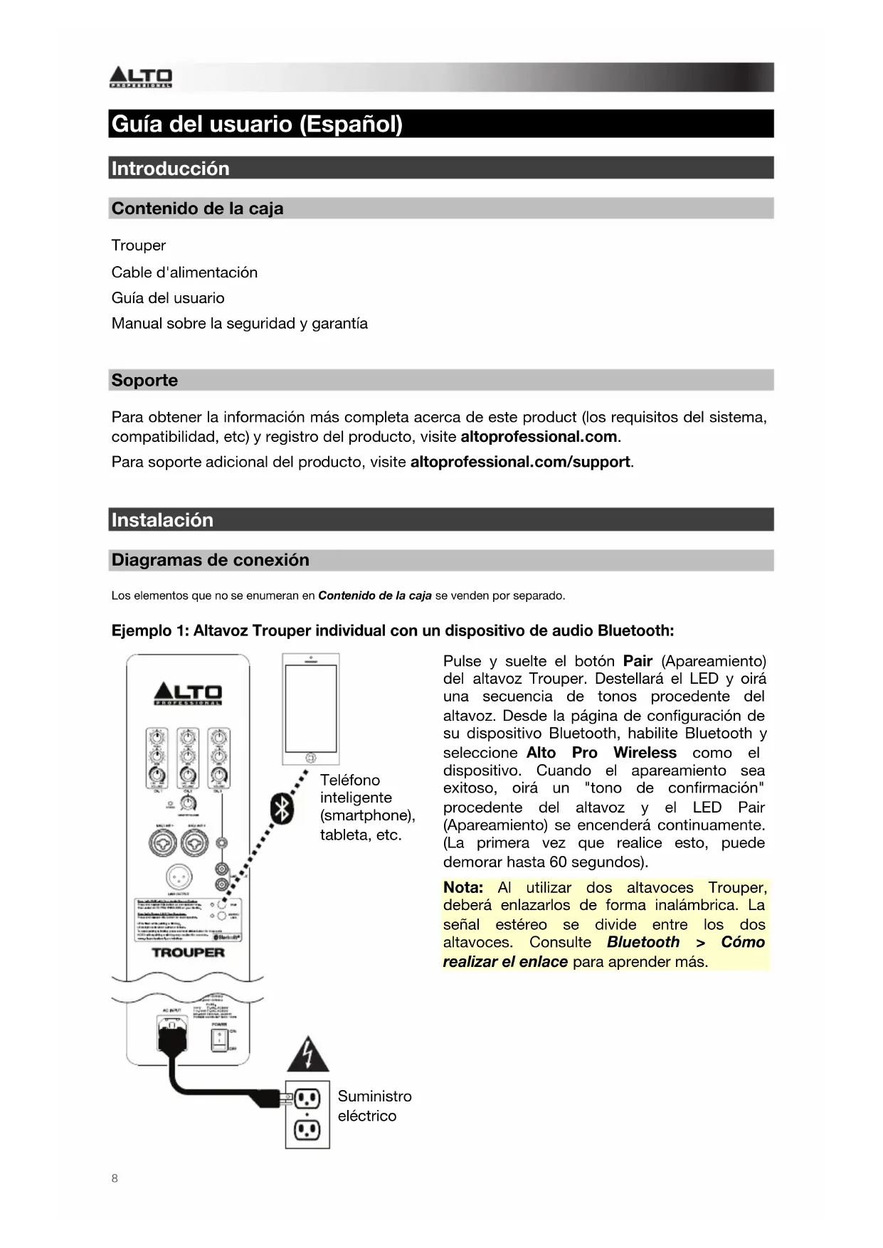 Instalación Diagramas de conexión Los elementos que no se enumeran en Contenido de la caja se venden por separado. Ejemplo 1: Altavoz Trouper individual con un dispositivo de audio Bluetooth: Pulse y suelte el botón Pair (Apareamiento) del altavoz Trouper. Destellará el LED y oirá una secuencia de tonos procedente del altavoz. Desde la página de configuración de su dispositivo Bluetooth, habilite Bluetooth y seleccione Alto Pro Wireless como el dispositivo. Cuando el apareamiento sea exitoso, oirá un "tono de confirmación" procedente del altavoz y el LED Pair (Apareamiento) se encenderá continuamente. (La primera vez que realice esto, puede demorar hasta 60 segundos). Nota: Al utilizar dos altavoces Trouper, deberá enlazarlos de forma inalámbrica. La señal estéreo se divide entre los dos altavoces. Consulte Bluetooth > Cómo realizar el enlace para aprender más. Teléfono inteligente (smartphone), tableta, etc. Suministro eléctrico9