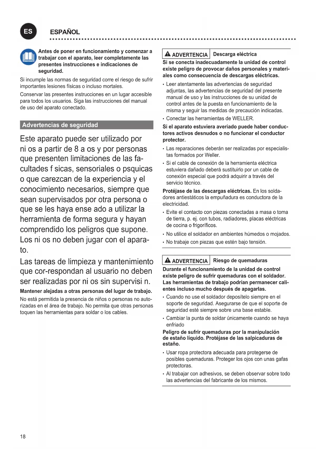 quidosogasesinamables cerca del soldador. Guarde las herramientas de soldar en un lugar seguro. Losaparatosyherramientasquenoseusendeben almacenarse en un lugar seco, elevado o cerrado, fuera del alcance de los niños. Desconectar las herramientas de soldaduraquenoseusenparadejarlassintensiónysin presión. El cable de la corriente eléctrica debe enchufarse únicamente en tomas de corriente (enchufe hembra) o en adaptadores homologados. Compruebe si la tensión de redcoincideconlaindicadaenlaplacadecaracterísticas. Asegurarsequelamáquinaestádesconectadaantesde enchufarla. Utilice el cable nicamente para aquellos nes para los que ha sido previsto.No sujetar nunca el aparato por el cable. No tire nunca del cable para desenchufar el enchufe de la toma de corriente. Proteja el cable del calor, de manchasdeaceiteydecantosalados. Preste atención. Prestar atención a lo que se hace. Realizareltrabajoconsentidocomún.Noutiliceelsoldador cuando esté desconcentrado. Evite posturas incorrectas. Laconguracióndellugarde trabajo debe ser ergonómica. Evitar posturas incorrectas duranteeltrabajo,yaquedanlugaralesiones. Utilice el soldador únicamente cuando esté en perfecto estado. Los dispositivos de protección no deben ponerse fuera de servicio. Las averías y los defectos deben solucionarse inme- diatamente. Antes de cada uso del aparato o herramienta, debe comprobarse minuciosamente que los dispositivos de seguridadfuncionanalaperfecciónydelaformaprevista. Comprobar que las piezas móviles funcionan perfectamente, quenoseatascanyquenoestándañadas.Paragarantizar el correcto funcionamiento del aparato, todas las piezas deberánestarmontadascorrectamenteycumplirtodoslos requisitos. Usar la herramienta adecuada. Utilizar solo accesorios o aparatos complementarios que estén incluidos en la lista de accesorios o que estén aprobados por el fabricante. Utilizar los accesorios o aparatos complementarios WELLER solamente en aparatos WELLER originales. El uso de otras herramientasyotrosaccesoriospuedeimplicarelriesgode sufrir lesiones. Asegurar la herramienta. Utilizar dispositivos de sujeción parajarlapiezadetrabajo. Usar un equipo de aspiración de humos de soldadura. Si se dispone de dispositivos para la conexión de equipos de aspiracióndehumosdesoldadura,asegúresedequeestos esténbienconectadosydequeseusencorrectamente. Aplicación De Acuerdo A La Finalidad Unidad de alimentación para herramientas de WELLER. Utilizarlaestacióndesoldarexclusivamenteparasoldary desoldarsegúnlostérminosprevistosenelmanualdeusoy en las condiciones descritas. Sóloestápermitidousaresteaparatoatemperaturaambien- teyeninteriores.Protegerdelahumedadydelaradiación directa del sol. Grupo de usuarios Debidoalosdiferentestiposderiesgoyelpotencialde riesgoalgunasoperacionesdeberánserrealizadasexclusi- vamente por especialistas. Operación Grupo de usuarios Parámetrosparasoldar Especialista con formación técnica Sustitución de piezas de recambio eléctricas Electricista Intervalos de manteni- miento Especialista en seguridad Manejo Usuarios normales Manejo Sustitución de piezas de recambio eléctricas Personas en periodo de formación bajo la super- visiónydireccióndeuna persona experimentada Cuidado y mantenimiento ADVERTENCIA Antes de realizar cualquier trabajo en la máquina, desenchufarla de la alimentación eléctrica. Dejar que se enfríe el aparato. Comprobarperiódicamentetodosloscablesymangueras conectados. Retirar las herramientas eléctricas defectuosas inmediatamente para que no se sigan utilizando. Las reparaciones deberán ser realizadas por especialis- tas formados por Weller. Use sólo piezas de recambio originales. Garantía Los derechos de reclamación por defectos del comprador prescribenunañodespuésdelacompra.Sóloválidopara