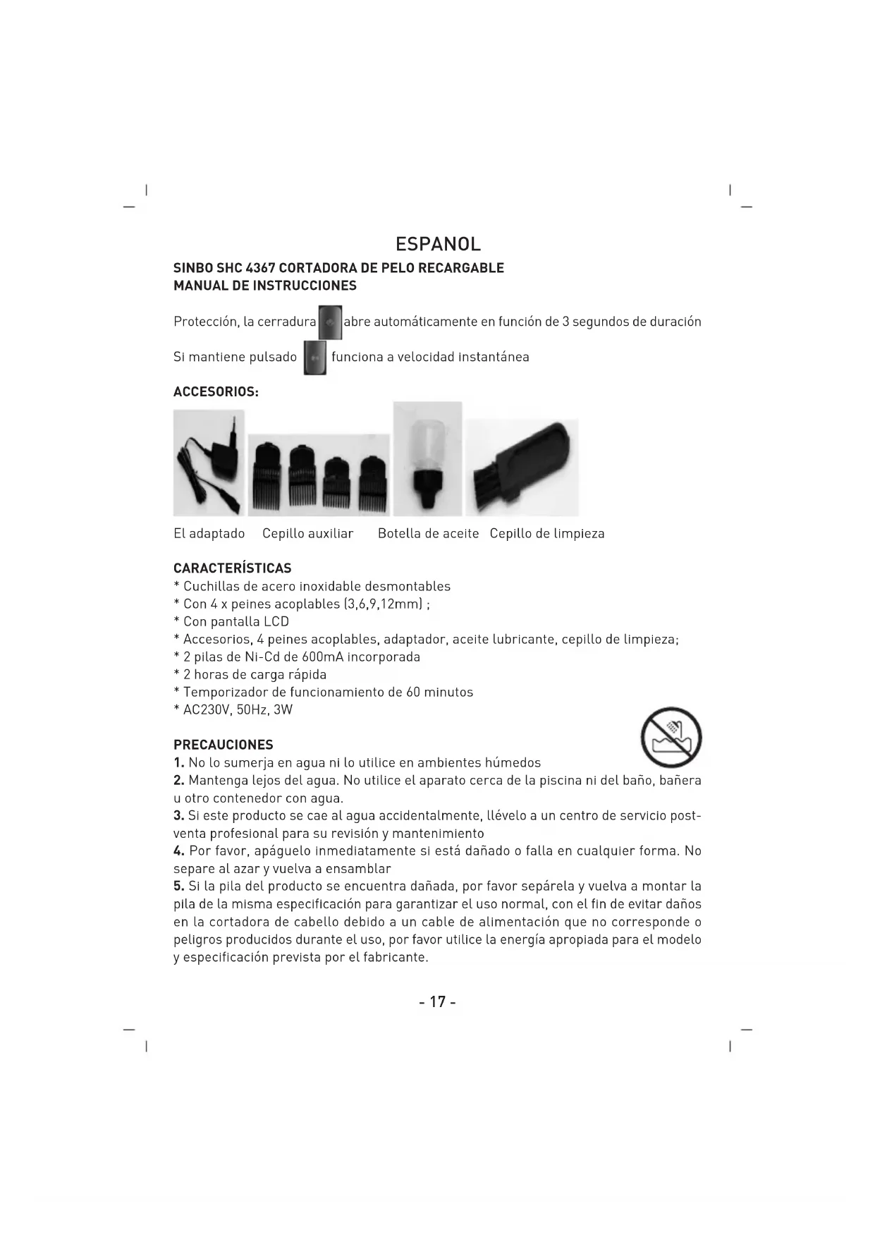 - Accesorios, 4 peines acoplables, adaptador, aceite lubricante, cepillo de limpieza;