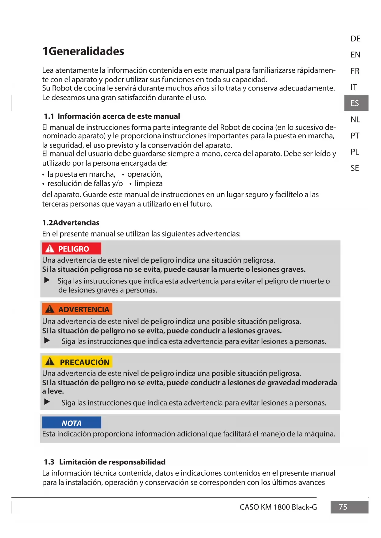 El manual de instrucciones forma parte integrante del Robot de cocina (en lo sucesivo de- nominado aparato) y le proporciona instrucciones importantes para la puesta en marcha, la seguridad, el uso previsto y la conservación del aparato. El manual del usuario debe guardarse siempre a mano, cerca del aparato. Debe ser leído y utilizado por la persona encargada de: