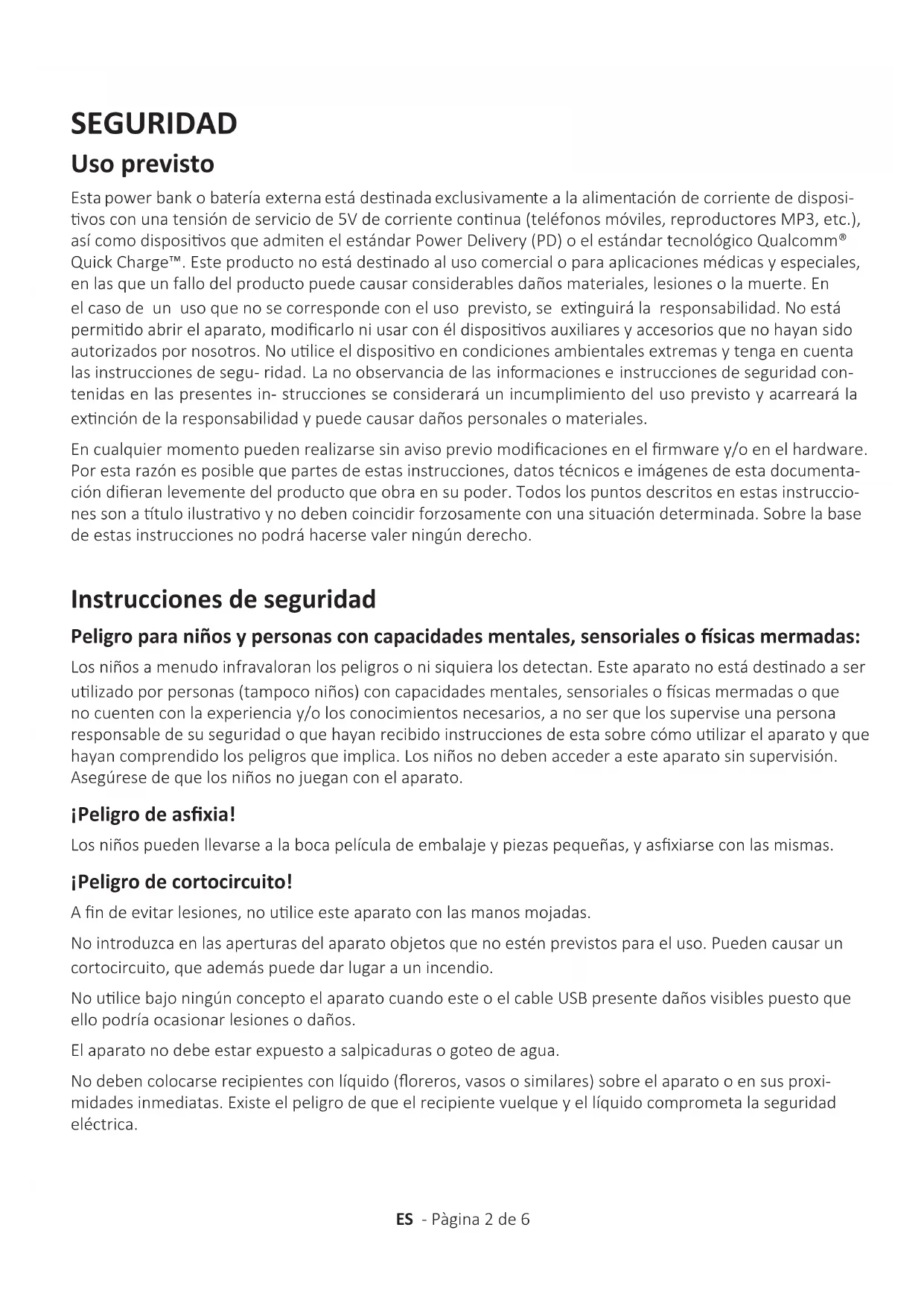 - Datos técnicos ES - Pàgina 1 de 6 Qualcomm Quick Charge es un producto de Qualcomm Technologies, Inc. Qualcomm es una marca de Qualcomm Incorporated registrada en Estados Unidos y otros países. Quick Charge es una marca registrada de Qualcomm Incorporated. Todas las marcas Qaulcomm Incorporated se utilizan con autorización.SEGURIDAD Uso previsto Esta power bank o batería externa está desnada exclusivamente a la alimentación de corriente de disposi- vos con una tensión de servicio de 5V de corriente connua (teléfonos móviles, reproductores MP3, etc.), así como disposivos que admiten el estándar Power Delivery (PD) o el estándar tecnológico Qualcomm® Quick Charge™. Este producto no está desnado al uso comercial o para aplicaciones médicas y especiales, en las que un fallo del producto puede causar considerables daños materiales, lesiones o la muerte. En el caso de un uso que no se corresponde con el uso previsto, se exnguirá la responsabilidad. No está permido abrir el aparato, modicarlo ni usar con él disposivos auxiliares y accesorios que no hayan sido autorizados por nosotros. No ulice el disposivo en condiciones ambientales extremas y tenga en cuenta las instrucciones de segu- ridad. La no observancia de las informaciones e instrucciones de seguridad con- tenidas en las presentes in- strucciones se considerará un incumplimiento del uso previsto y acarreará la exnción de la responsabilidad y puede causar daños personales o materiales. En cualquier momento pueden realizarse sin aviso previo modicaciones en el rmware y/o en el hardware. Por esta razón es posible que partes de estas instrucciones, datos técnicos e imágenes de esta documenta- ción dieran levemente del producto que obra en su poder. Todos los puntos descritos en estas instruccio- nes son a tulo ilustravo y no deben coincidir forzosamente con una situación determinada. Sobre la base de estas instrucciones no podrá hacerse valer ningún derecho. Instrucciones de seguridad Peligro para niños y personas con capacidades mentales, sensoriales o sicas mermadas: Los niños a menudo infravaloran los peligros o ni siquiera los detectan. Este aparato no está desnado a ser ulizado por personas (tampoco niños) con capacidades mentales, sensoriales o sicas mermadas o que no cuenten con la experiencia y/o los conocimientos necesarios, a no ser que los supervise una persona responsable de su seguridad o que hayan recibido instrucciones de esta sobre cómo ulizar el aparato y que hayan comprendido los peligros que implica. Los niños no deben acceder a este aparato sin supervisión. Asegúrese de que los niños no juegan con el aparato. ¡Peligro de asxia! Los niños pueden llevarse a la boca película de embalaje y piezas pequeñas, y asxiarse con las mismas. ¡Peligro de cortocircuito! A n de evitar lesiones, no ulice este aparato con las manos mojadas. No introduzca en las aperturas del aparato objetos que no estén previstos para el uso. Pueden causar un cortocircuito, que además puede dar lugar a un incendio. No ulice bajo ningún concepto el aparato cuando este o el cable USB presente daños visibles puesto que ello podría ocasionar lesiones o daños. El aparato no debe estar expuesto a salpicaduras o goteo de agua. No deben colocarse recipientes con líquido (oreros, vasos o similares) sobre el aparato o en sus proxi- midades inmediatas. Existe el peligro de que el recipiente vuelque y el líquido comprometa la seguridad eléctrica. ES - Pàgina 2 de 6¡Peligro de tropiezo! Al posicionar el aparato, compruebe que nadie pueda pisar el cable o tropezar con él. No coloque objetos sobre el cable. ¡Daño! No ulice el aparato en entornos extremadamente calientes, fríos, húmedos o polvorientos. No lo exponga a la radiación solar directa. Proteja el producto de llamas directas. ¡Peligro de explosión! Proteja el aparato en cualquier estado de funcionamiento contra golpes y caídas. Este aparato es sensible respecto a la descarga electrostáca. Por esta razón, proteja el aparato contra cualquier posible descarga electrostáca. A n de evitar fallos de funcionamiento, no conecte las conexiones de salida USB del aparato con puertos USB de ordenadores u otros disposivos. Esas conexiones solo están desnadas a la carga de disposivos. A n de evitar un sobrecalentamiento, no bloquee ni cubra las aperturas del producto. No cubra completamente el producto durante el funcionamiento, a n de garanzar la disipación de calor. No abra la carcasa del aparato y no desmonte componentes individuales. No intente reparar usted mismo el aparato. En ese caso se exngue la garana. ¡ADVERTENCIA! ¡Supercie caliente! Mientras el disposivo esté en uso, sujetarlo durante un empo prolongado puede causar lesiones en la piel por su elevada temperatura. Cuando lo uli- ce, evite sujetarlo en las áreas que estén parcularmente calientes. No ulice el disposivo directamente sobre su cuerpo. Una vez frío, el disposivo se puede tocar de forma permanente. Declaración de conformidad l marcado CE indica que este producto cumple los requisitos de todas las Direcvas de la UE vigentes para este producto. p. 6