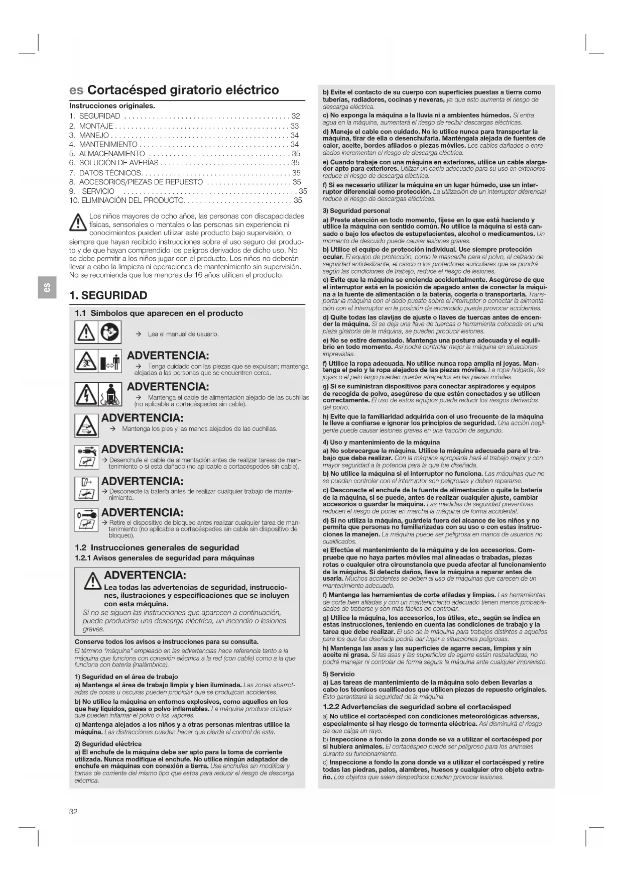 eles Cortacésped giratorio eléctrico Instrucciones originales. Los niños mayores de ocho años, las personas con discapacidades físicas, sensoriales o mentales o las personas sin experiencia ni conocimientos pueden utilizar este producto bajo supervisión, o siempre que hayan recibido instrucciones sobre el uso seguro del produc- to y de que hayan comprendido los peligros derivados de dicho uso. No se debe permitir a los niños jugar con el producto. Los niños no deberán llevar a cabo la limpieza ni operaciones de mantenimiento sin supervisión. No se recomienda que los menores de 16 años utilicen el producto.