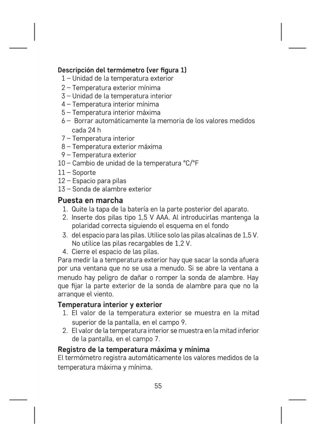 de la pantalla, en el campo 7. Registro de la temperatura máxima y mínima El termómetro registra automáticamente los valores medidos de la temperatura máxima y mínima.56 Los valores de la temperatura exterior (OUT) se muestran en los campos 2 y 8. Los valores de la temperatura interior (IN) se muestran en los campos 4 y 5. La memoria de las medidas se borra automáticamente cada 24 h, desde la hora de la inserción de las pilas. Ejemplo: Si inserta las pilas a las 7:00 de la mañana, la memoria se borrará cada siguiente día a las 7:00 de la mañana. Cambio de la unidad de temperatura °C/°F Quite las pilas del termómetro. Cambie el interruptor en la parte trasera del termómetro a la posición °C o °F. Inserte las pilas otra vez en el termómetro. Cuidado y mantenimiento El producto está diseñado para que su vida útil sea larga y able si se utiliza de una manera adecuada. Aquí hay algunos consejos para su manipulación correcta: