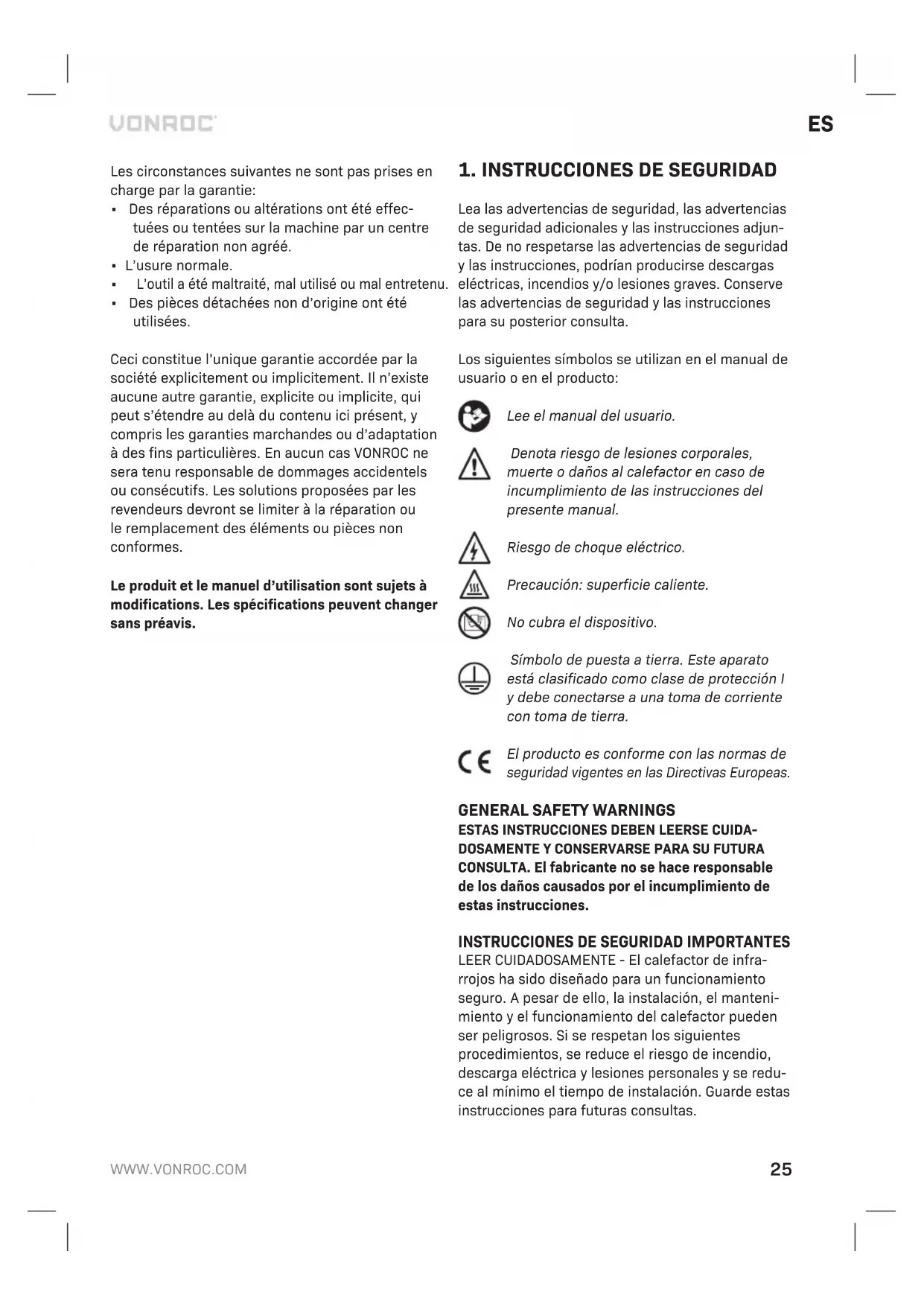 Lea las advertencias de seguridad, las advertencias de seguridad adicionales y las instrucciones adjun- tas. De no respetarse las advertencias de seguridad y las instrucciones, podrían producirse descargas eléctricas, incendios y/o lesiones graves. Conserve las advertencias de seguridad y las instrucciones para su posterior consulta. Los siguientes símbolos se utilizan en el manual de usuario o en el producto: Lee el manual del usuario. Denota riesgo de lesiones corporales, muerte o daños al calefactor en caso de incumplimiento de las instrucciones del presente manual. Riesgo de choque eléctrico. Precaución: superficie caliente. No cubra el dispositivo. Símbolo de puesta a tierra. Este aparato está clasificado como clase de protección I y debe conectarse a una toma de corriente con toma de tierra. El producto es conforme con las normas de seguridad vigentes en las Directivas Europeas.