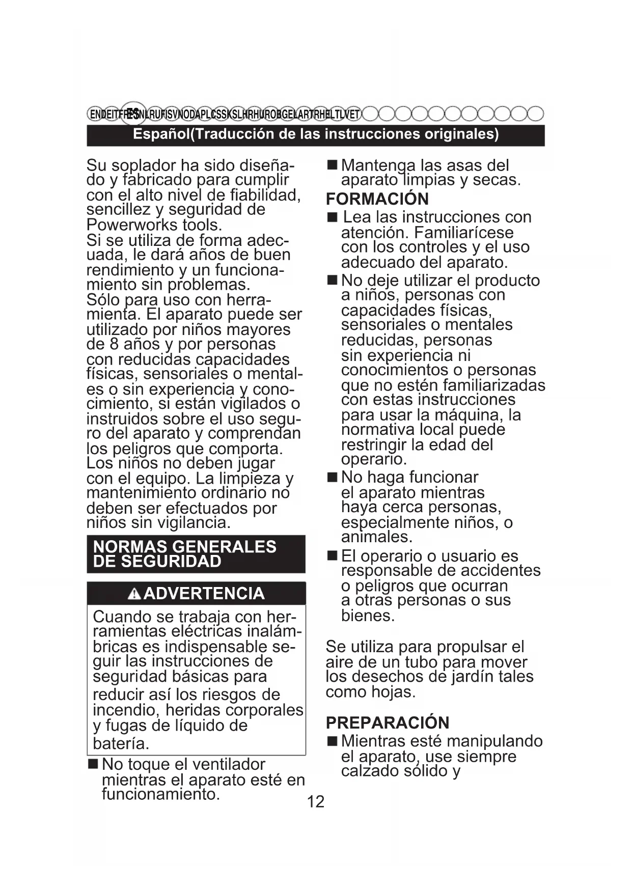 EN DE IT FR PT NL RU FI SV NO DA PL CS SK SL HR HU RO BG EL AR TR HE LT LV ET Su soplador ha sido diseña- do y fabricado para cumplir con el alto nivel de fiabilidad, sencillez y seguridad de Powerworks tools. Si se utiliza de forma adec- uada, le dará años de buen rendimiento y un funciona- miento sin problemas. Sólo para uso con herra- mienta. El aparato puede ser utilizado por niños mayores de 8 años y por personas con reducidas capacidades físicas, sensoriales o mental- es o sin experiencia y cono- cimiento, si están vigilados o instruidos sobre el uso segu- ro del aparato y comprendan los peligros que comporta. Los niños no deben jugar con el equipo. La limpieza y mantenimiento ordinario no deben ser efectuados por niños sin vigilancia. NORMAS GENERALES DE SEGURIDAD ADVERTENCIA Cuando se trabaja con her- ramientas eléctricas inalám- bricas es indispensable se- guir las instrucciones de dad básicas para No toque el ventilador mientras el aparato esté en funcionamiento. Mantenga las asas del aparato limpias y secas. FORMACIÓN Lea las instrucciones con atención. Familiarícese con los controles y el uso adecuado del aparato. No deje utilizar el producto a niños, personas con capacidades físicas, sensoriales o mentales reducidas, personas sin experiencia ni conocimientos o personas que no estén familiarizadas con estas instrucciones para usar la máquina, la normativa local puede restringir la edad del operario. No haga funcionar el aparato mientras haya cerca personas, especialmente niños, o animales. El operario o usuario es responsable de accidentes o peligros que ocurran a otras personas o sus bienes. Se utiliza para propulsar el aire de un tubo para mover los desechos de jardín tales como hojas. PREPARACIÓN Mientras esté manipulando el aparato, use siempre calzado sólido y