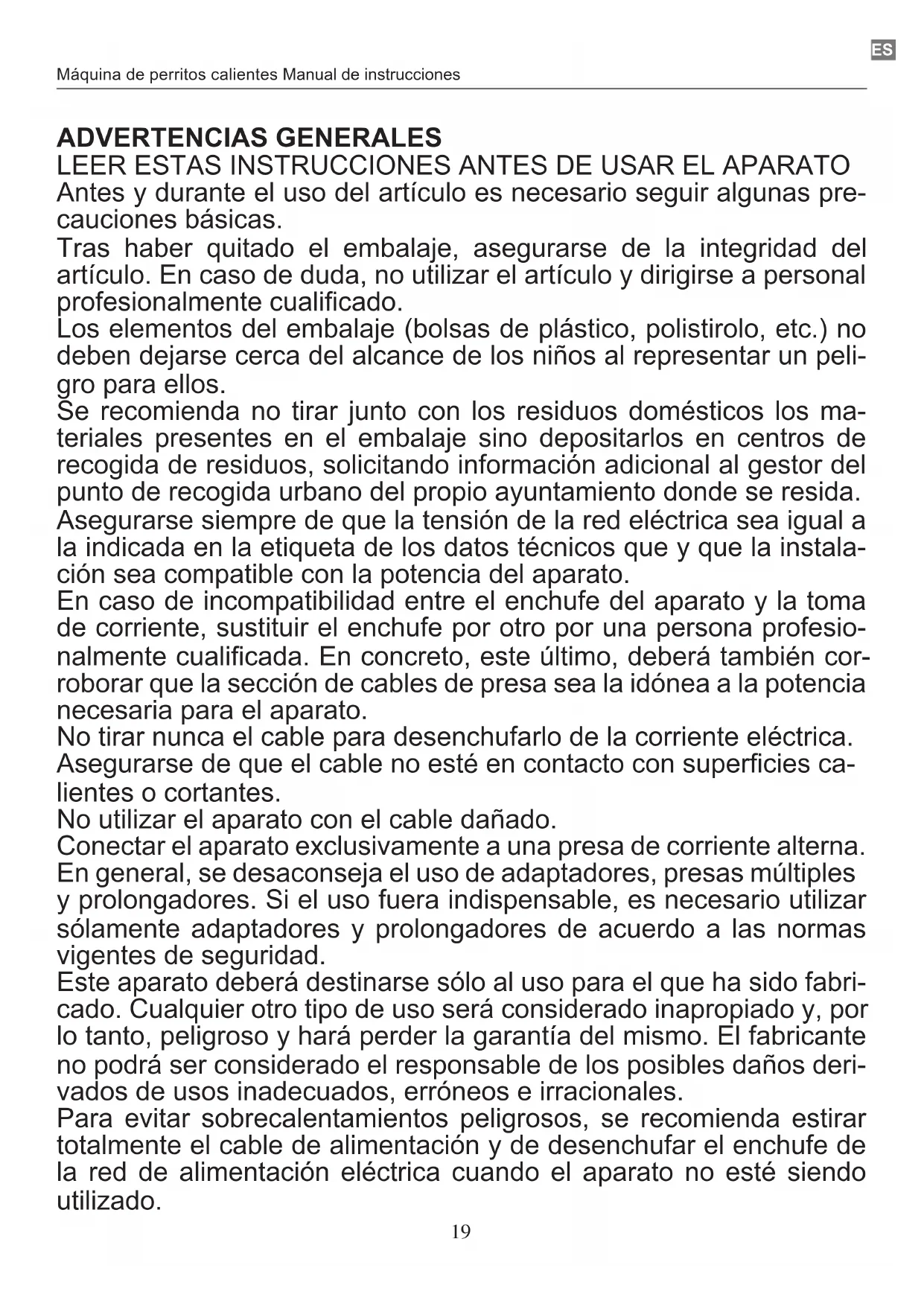 Este aparato deverá destinarse sólo al uso para el que ha sido fabricado. Cualquier除外 tipo de uso sera considerado inapropiado y, por lo tanto, peligioso y hará perdcer la garantía del mesmo. El fabricante noURTRA ser considerado el responsable de los posibles daños derivados de usos inadequados, erróneos e irrazonales.