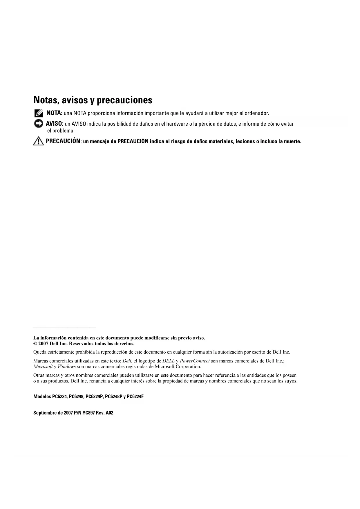 - Wyłączona: Brak połączenia214 Instrukcja uruchomienia www.dell.com | support.dell.comwww.dell.com | support.dell.com Conmutadores apilables Dell™ PowerConnect™ serie 6200 Guía de introducción Modelos PC6224, PC6248, PC6224P, PC6248P y PC6224FNotas, avisos y precauciones NOTA: una NOTA proporciona información importante que le ayudará a utilizar mejor el ordenador. AVISO: un AVISO indica la posibilidad de daños en el hardware o la pérdida de datos, e informa de cómo evitar el problema. PRECAUCIÓN: un mensaje de PRECAUCIÓN indica el riesgo de daños materiales, lesiones o incluso la muerte.