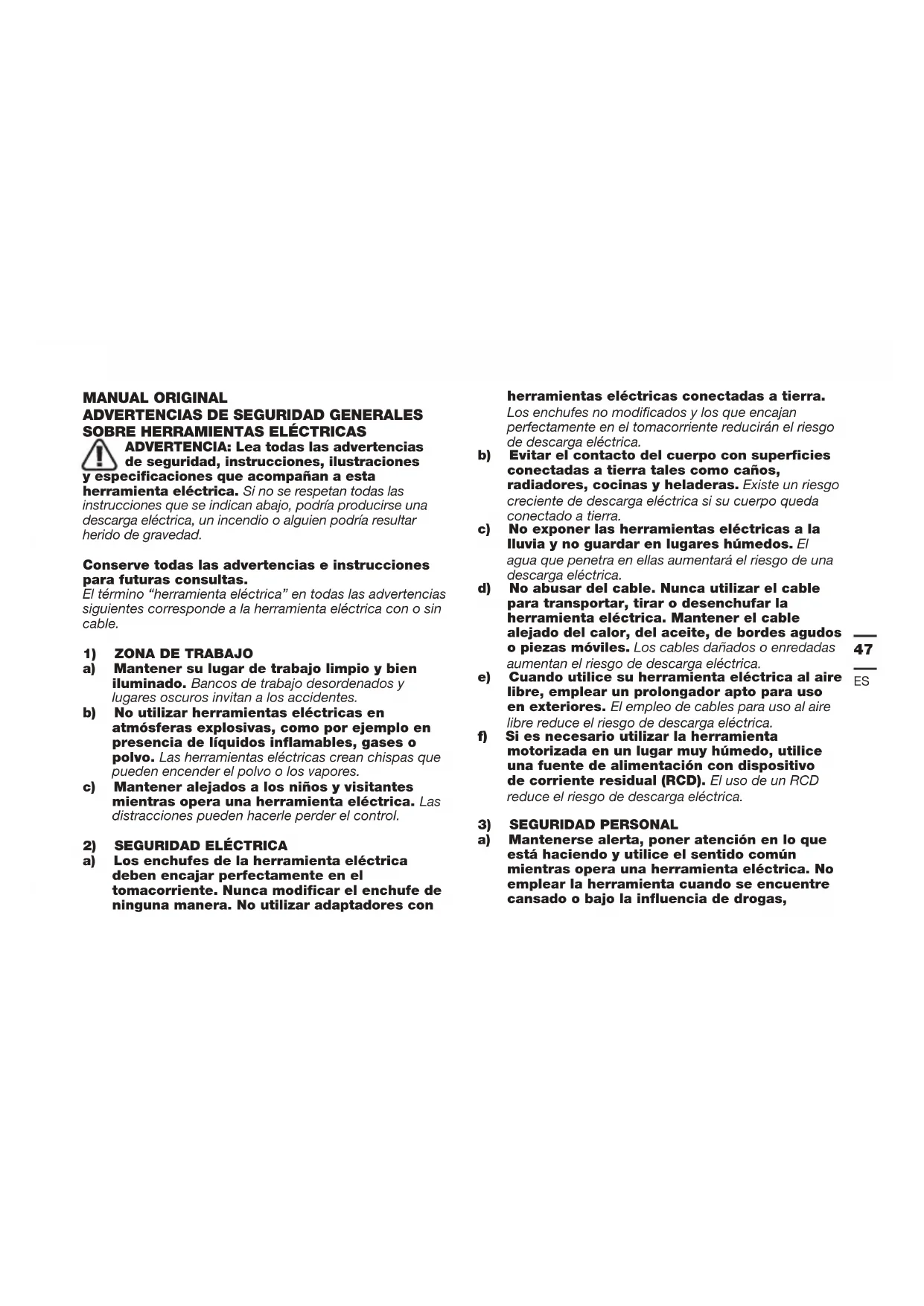 MANTENIMIENTO de la HERRAMIENTA MOTORIZADA a) No forzar la herramienta eléctrica. Utilizar la herramienta eléctrica correcta para su aplicación. La herramienta eléctrica correcta hará el trabajo mejor y más seguro a la velocidad para la cual fue diseñada. b) No utilizar la herramienta eléctrica si el interruptor no la enciende o apaga. Cualquier herramienta eléctrica que no pueda ser controlada con el interruptor es peligrosa y debe ser reparada. c) Desconecte la clavija de la fuente de alimentación o extraiga la batería (si es desmontable) de la herramienta eléctrica antes de realizar cualquier ajuste, cambiar los accesorios o guardar la herramienta. Tales medidas de seguridad preventivas reducen el riesgo de arranque accidental de la herramienta. d) Mantener las herramientas eléctricas que no usa fuera del alcance de los niños y no permita que personas no familiarizadas con la herramienta o con estas instrucciones maneje la herramienta eléctrica. Las herramientas eléctricas son peligrosas en manos de usuarios inexpertos. e) Realice un mantenimiento adecuado de las herramientas eléctricas y sus accesorios. Comprobar si hay desalineamiento o atascamiento de piezas móviles, rotura de piezas en general y cualquier otra condición que pueda afectar la operación normal de la herramienta. Si se verifican daños, recurra49