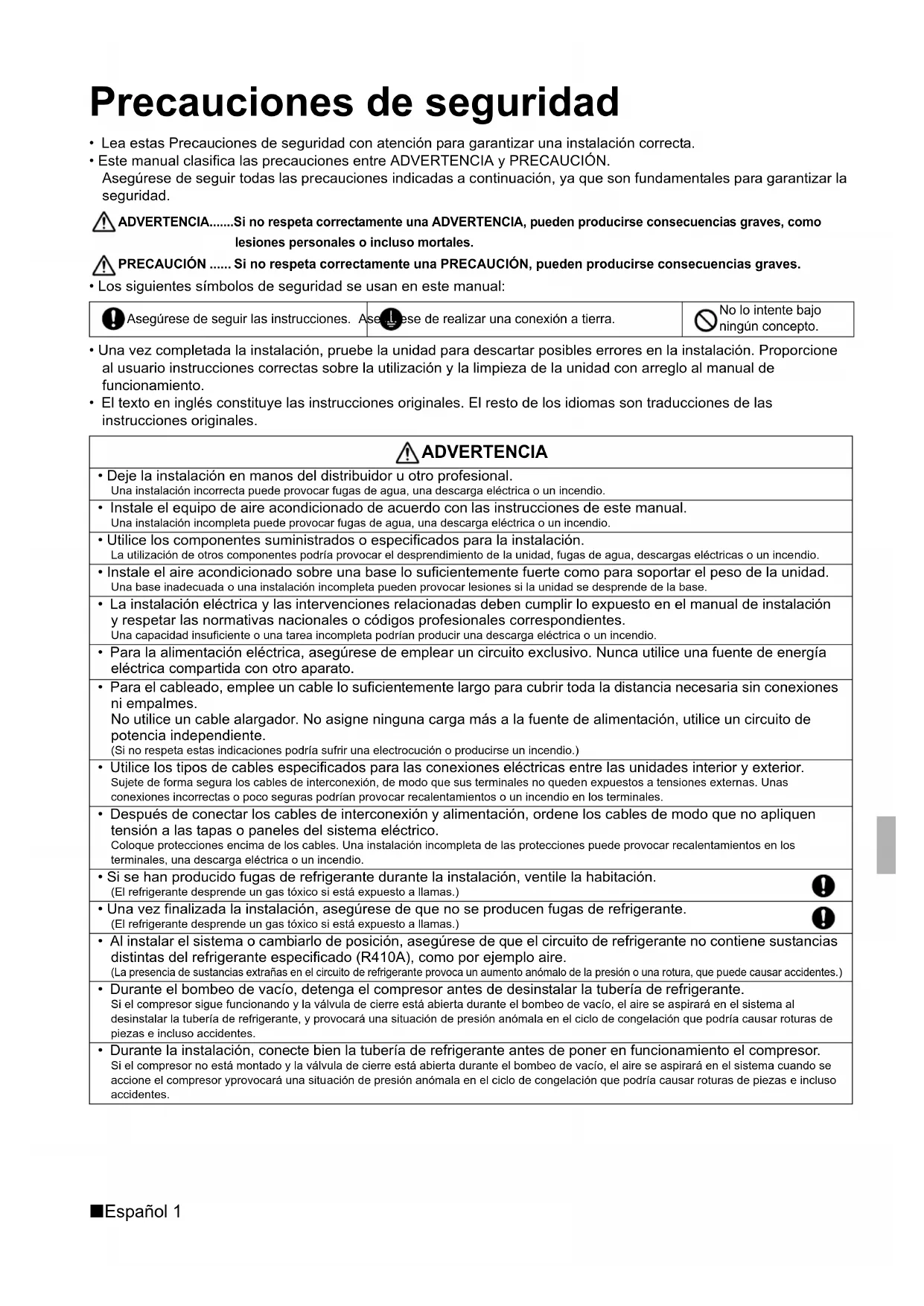 - Este manual clasifica las precauciones entre ADVERTENCIA y PRECAUCIÓN. Asegúrese de seguir todas las precauciones indicadas a continuación, ya que son fundamentales para garantizar la seguridad. ADVERTENCIA.......Si no respeta correctamente una ADVERTENCIA, pueden producirse consecuencias graves, como lesiones personales o incluso mortales. PRECAUCIÓN ...... Si no respeta correctamente una PRECAUCIÓN, pueden producirse consecuencias graves.