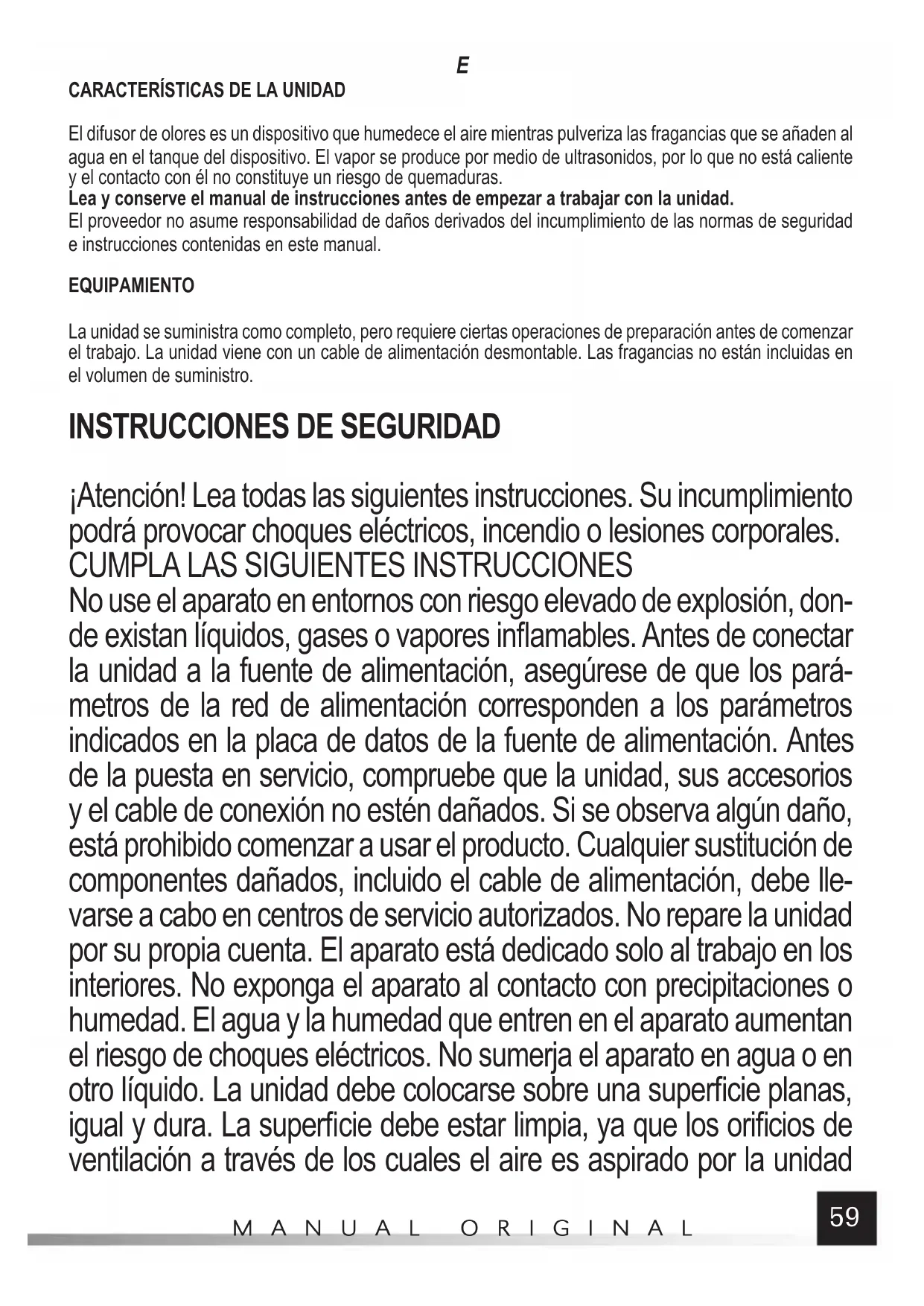 El difusor de olores es un dispositivo que humedece el aire mientras pulveriza las fragancias que se añaden al agua en el tanque del dispositivo. El vapor se produce por medio de ultrasonidos, por lo que no está caliente y el contacto con él no constituye un riesgo de quemaduras. Lea y conserve el manual de instrucciones antes de empezar a trabajar con la unidad. El proveedor no asume responsabilidad de daños derivados del incumplimiento de las normas de seguridad e instrucciones contenidas en este manual. EQUIPAMIENTO La unidad se suministra como completo, pero requiere ciertas operaciones de preparación antes de comenzar el trabajo. La unidad viene con un cable de alimentación desmontable. Las fragancias no están incluidas en el volumen de suministro.
