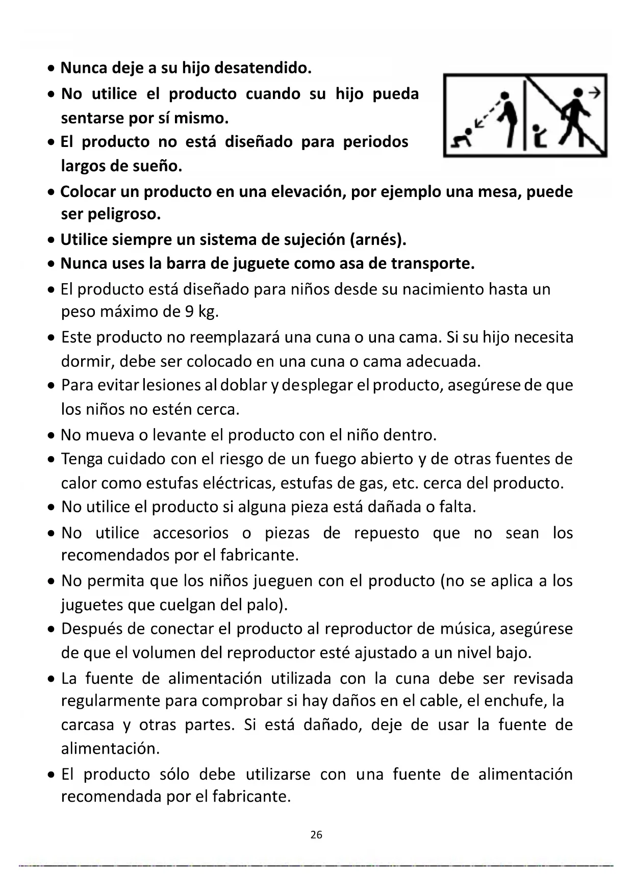 - Este producto no reemplazará una cuna o una cama. Si su hijo necesita dormir, debe ser colocado en una cuna o cama adecuada.