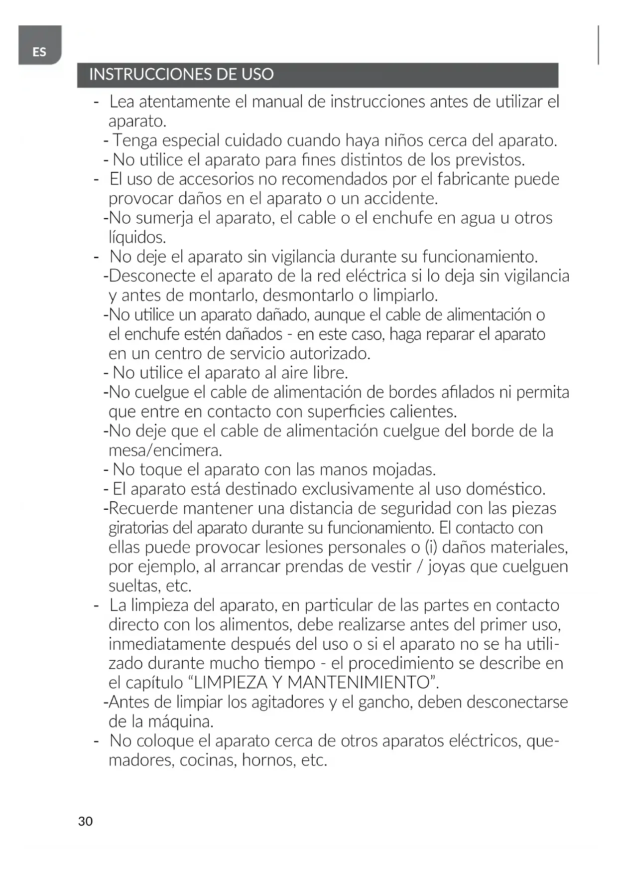 Antes de limpiar los agitadores y el gancho, deben desconectarse de la máquina. - No coloque el aparato cerca de otros aparatos eléctricos, que