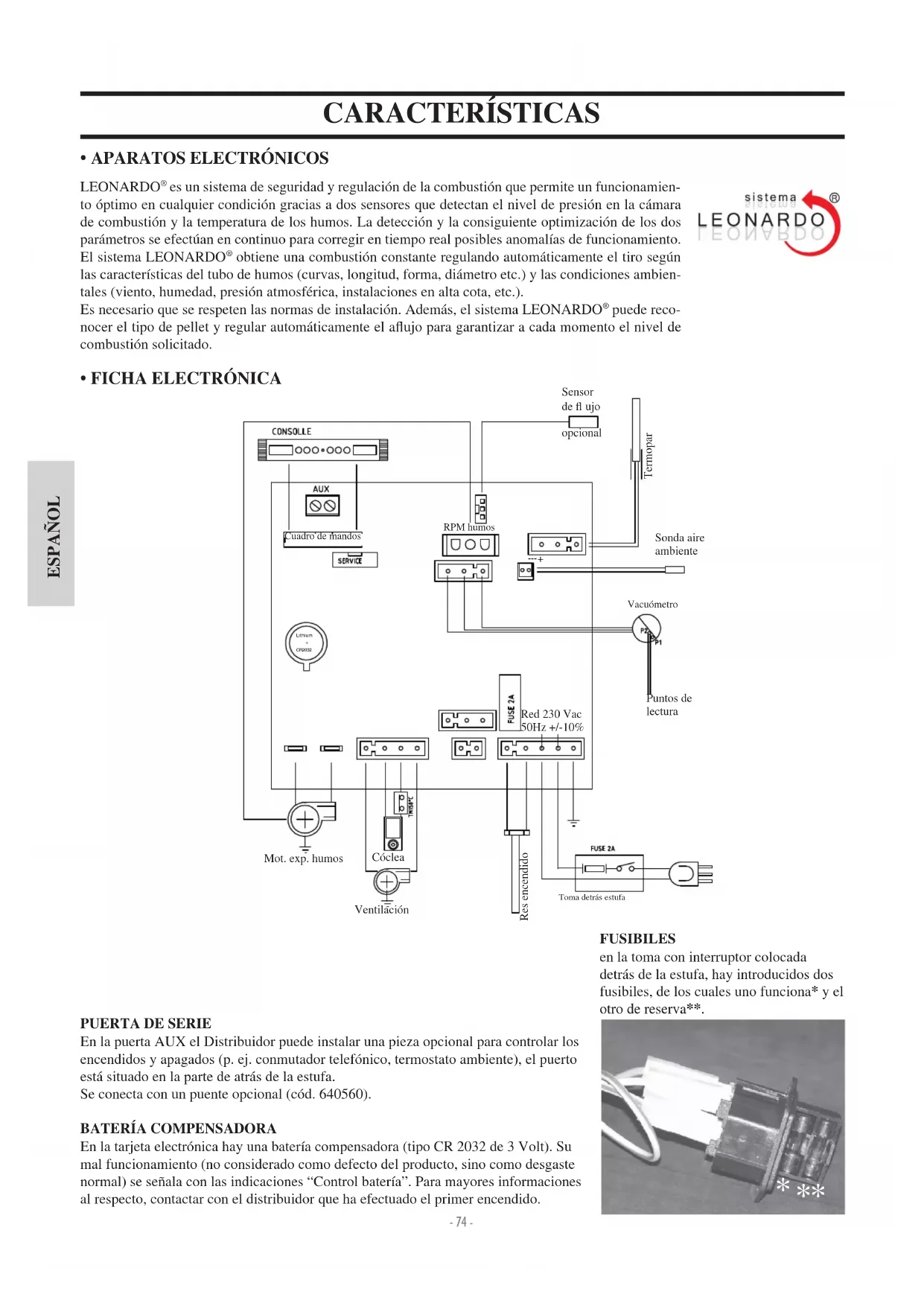 puede reco- nocer el tipo de pellet y regular automáticamente el afl ujo para garantizar a cada momento el nivel de combustión solicitado. +---Lithium CR2032Red 230 Vac50Hz +/-10%Toma detrás estufa RPM humos Sensorde fl ujoTermoparSonda aireambiente Vacuómetro Puntos delecturaMot. exp. humosRes encendidoVentilaciónCócleaopcional Cuadro de mandos- 75 - ESPAÑOL CARACTERÍSTICAS