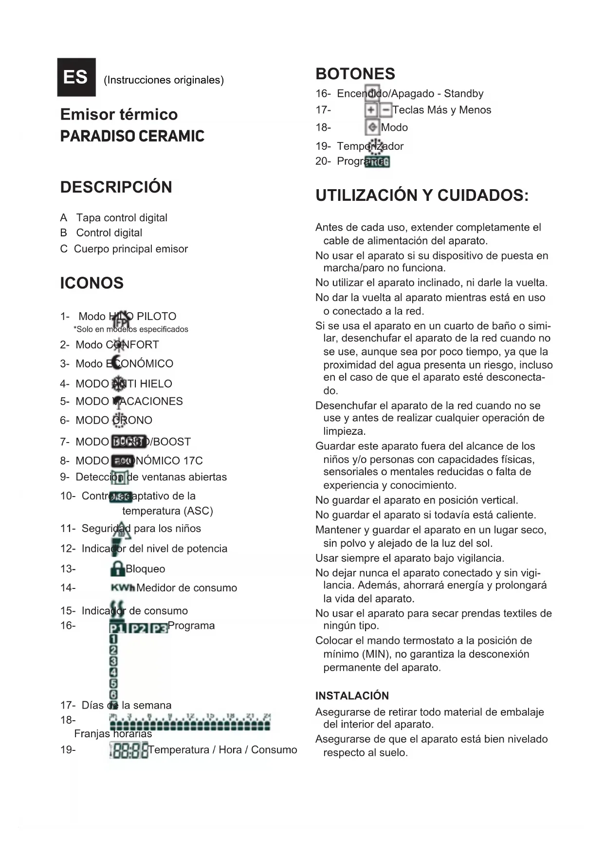 DEL APARATO: Parar el aparato, accionando el botón marcha/ paro. Desenchufar el aparato de la red eléctrica. Dejar enfriar el radiador Limpiar el aparato. PROTECTOR TÉRMICO DE SEGURIDAD: El aparato dispone de un dispositivo térmico de seguridad que protege el aparato de cualquier sobrecalentamiento. Cuando el aparato se conecta y desconecta alternativamente, no siendo ello debido a la acción del termostato de ambiente, vericar que no haya ningún obstáculo que impida o diculte la entrada o salida normal del aire. Si el aparato se desconecta por sí mismo y no vuelve a conectarse, proceder a desenchufarlo de la red, esperar unos 15 minutos antes de volver a conectarlo, Si sigue sin funcionar, acu- dir a uno de los servicios de asistencia técnica autorizados. LIMPIEZA Desenchufar el aparato de la red y dejarlo enfriar antes de iniciar cualquier operación de limpieza. Limpiar el aparato con un paño húmedo impreg- nado con unas gotas de detergente y secarlo después. No utilizar disolventes, ni productos con un factor pH ácido o básico como la lejía, ni productos abrasivos, para la limpieza del aparato. No deje entrar agua u otro líquido por las aber- turas de ventilación para evitar daños en las partes operativas interiores del aparato. No sumergir el aparato en agua u otro líquido, ni ponerlo bajo el grifo. Si el aparato no se mantiene en buen estado de limpieza, su supercie puede degradarse y afectar de forma inexorable la duración de la vida del aparato y conducir a una situación peligrosa. Nota: Cuando se ponga el aparato en marcha en función calefactor, después de estar una larga temporada parado o funcionado solo con la función ventilador, es posible que despren- da al principio un ligero humo, sin ninguna consecuencia, debido a que se está quemando el polvo y otras partículas acumuladas en el elemento calefactor. Este fenómeno se puede evitar limpiando previamente y a través de las rendijas del aparato, su interior con la ayuda de un aspirador o con un chorro de aire a presión.Heater PARADISO CERAMIC DESCRIPTION A Digital control cover B Digital control C Main transmitting body ICONS