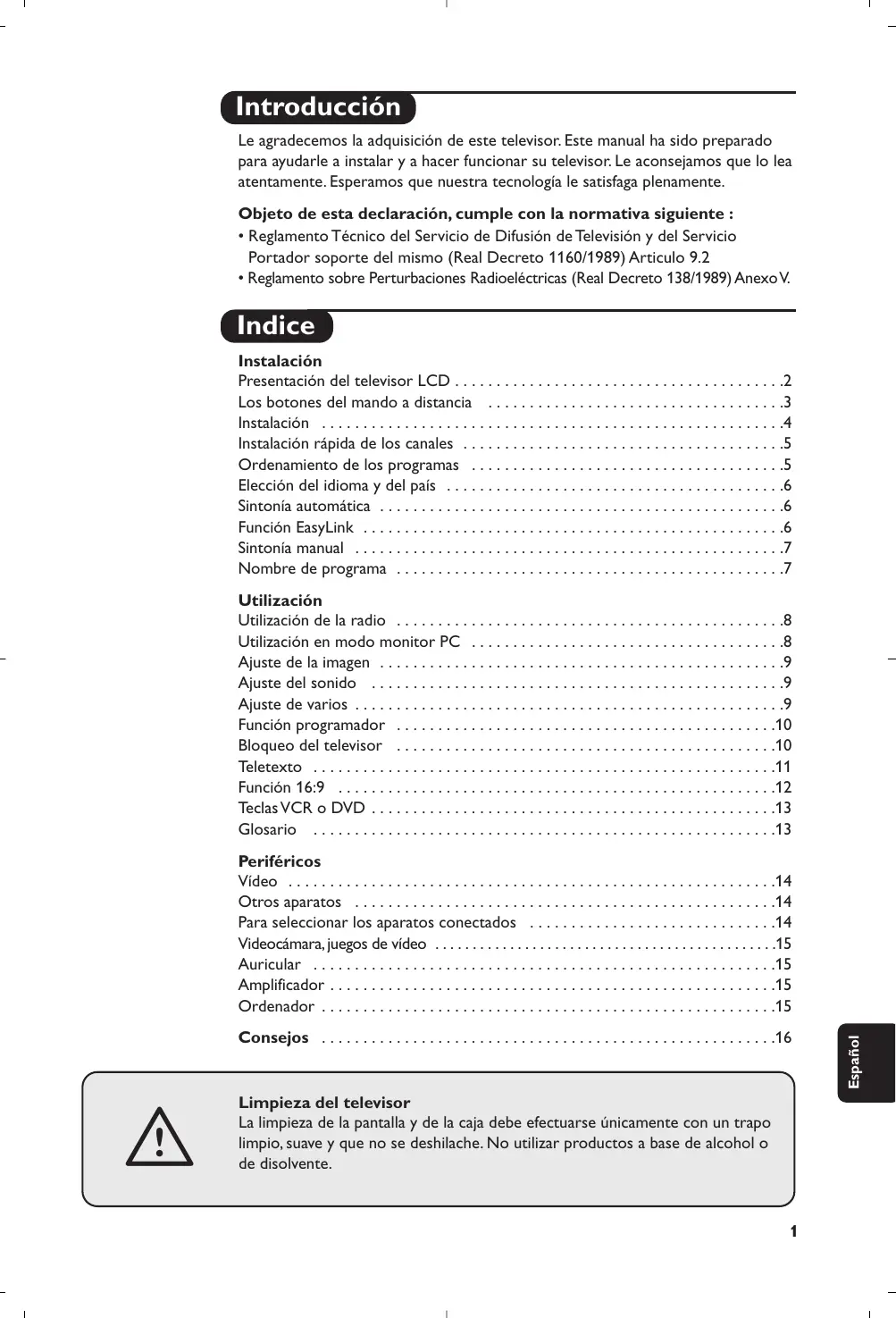 - Reglamento sobre Perturbaciones Radioeléctricas (Real Decreto 138/1989) Anexo V. Indice Instalación Presentación del televisor LCD . . . . . . . . . . . . . . . . . . . . . . . . . . . . . . . . . . . . . . . .2 Los botones del mando a distancia . . . . . . . . . . . . . . . . . . . . . . . . . . . . . . . . . . . .3 Instalación . . . . . . . . . . . . . . . . . . . . . . . . . . . . . . . . . . . . . . . . . . . . . . . . . . . . . . . .4 Instalación rápida de los canales . . . . . . . . . . . . . . . . . . . . . . . . . . . . . . . . . . . . . . .5 Ordenamiento de los programas . . . . . . . . . . . . . . . . . . . . . . . . . . . . . . . . . . . . . .5 Elección del idioma y del país . . . . . . . . . . . . . . . . . . . . . . . . . . . . . . . . . . . . . . . . .6 Sintonía automática . . . . . . . . . . . . . . . . . . . . . . . . . . . . . . . . . . . . . . . . . . . . . . . . .6 Función EasyLink . . . . . . . . . . . . . . . . . . . . . . . . . . . . . . . . . . . . . . . . . . . . . . . . . . .6 Sintonía manual . . . . . . . . . . . . . . . . . . . . . . . . . . . . . . . . . . . . . . . . . . . . . . . . . . . .7 Nombre de programa . . . . . . . . . . . . . . . . . . . . . . . . . . . . . . . . . . . . . . . . . . . . . . .7 Utilización Utilización de la radio . . . . . . . . . . . . . . . . . . . . . . . . . . . . . . . . . . . . . . . . . . . . . . .8 Utilización en modo monitor PC . . . . . . . . . . . . . . . . . . . . . . . . . . . . . . . . . . . . . .8 Ajuste de la imagen . . . . . . . . . . . . . . . . . . . . . . . . . . . . . . . . . . . . . . . . . . . . . . . . .9 Ajuste del sonido . . . . . . . . . . . . . . . . . . . . . . . . . . . . . . . . . . . . . . . . . . . . . . . . . .9 Ajuste de varios . . . . . . . . . . . . . . . . . . . . . . . . . . . . . . . . . . . . . . . . . . . . . . . . . . . .9 Función programador . . . . . . . . . . . . . . . . . . . . . . . . . . . . . . . . . . . . . . . . . . . . . .10 Bloqueo del televisor . . . . . . . . . . . . . . . . . . . . . . . . . . . . . . . . . . . . . . . . . . . . . .10 Teletexto . . . . . . . . . . . . . . . . . . . . . . . . . . . . . . . . . . . . . . . . . . . . . . . . . . . . . . . .11 Función 16:9 . . . . . . . . . . . . . . . . . . . . . . . . . . . . . . . . . . . . . . . . . . . . . . . . . . . . .12 Teclas VCR o DVD . . . . . . . . . . . . . . . . . . . . . . . . . . . . . . . . . . . . . . . . . . . . . . . . .13 Glosario . . . . . . . . . . . . . . . . . . . . . . . . . . . . . . . . . . . . . . . . . . . . . . . . . . . . . . . .13 Limpieza del televisor La limpieza de la pantalla y de la caja debe efectuarse únicamente con un trapo limpio, suave y que no se deshilache. No utilizar productos a base de alcohol o de disolvente.