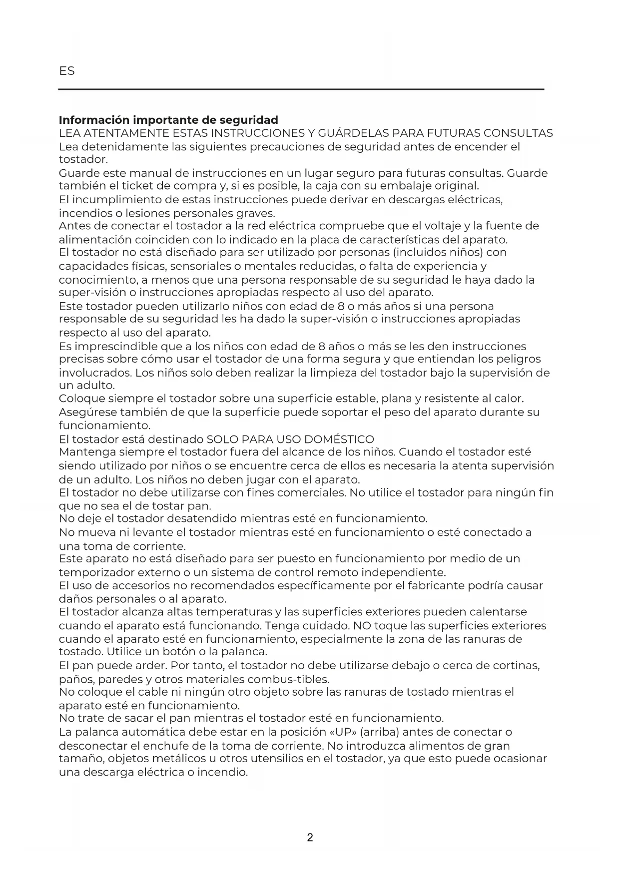 TOSTADORA TOASTER BIANCAES Información importante de seguridad LEA ATENTAMENTE ESTAS INSTRUCCIONES Y GUÁRDELAS PARA FUTURAS CONSULTAS Lea detenidamente las siguientes precauciones de seguridad antes de encender el tostador. Guarde este manual de instrucciones en un lugar seguro para futuras consultas. Guarde también el ticket de compra y, si es posible, la caja con su embalaje original. El incumplimiento de estas instrucciones puede derivar en descargas eléctricas, incendios o lesiones personales graves. Antes de conectar el tostador a la red eléctrica compruebe que el voltaje y la fuente de alimentación coinciden con lo indicado en la placa de características del aparato. El tostador no está diseñado para ser utilizado por personas (incluidos niños) con capacidades físicas, sensoriales o mentales reducidas, o falta de experiencia y conocimiento, a menos que una persona responsable de su seguridad le haya dado la super-visión o instrucciones apropiadas respecto al uso del aparato. Este tostador pueden utilizarlo niños con edad de 8 o más años si una persona responsable de su seguridad les ha dado la super-visión o instrucciones apropiadas respecto al uso del aparato. Es imprescindible que a los niños con edad de 8 años o más se les den instrucciones precisas sobre cómo usar el tostador de una forma segura y que entiendan los peligros involucrados. Los niños solo deben realizar la limpieza del tostador bajo la supervisión de un adulto. Coloque siempre el tostador sobre una superficie estable, plana y resistente al calor. Asegúrese también de que la superficie puede soportar el peso del aparato durante su funcionamiento. El tostador está destinado SOLO PARA USO DOMÉSTICO Mantenga siempre el tostador fuera del alcance de los niños. Cuando el tostador esté siendo utilizado por niños o se encuentre cerca de ellos es necesaria la atenta supervisión de un adulto. Los niños no deben jugar con el aparato. El tostador no debe utilizarse con fines comerciales. No utilice el tostador para ningún fin que no sea el de tostar pan. No deje el tostador desatendido mientras esté en funcionamiento. No mueva ni levante el tostador mientras esté en funcionamiento o esté conectado a una toma de corriente. Este aparato no está diseñado para ser puesto en funcionamiento por medio de un temporizador externo o un sistema de control remoto independiente. El uso de accesorios no recomendados específicamente por el fabricante podría causar daños personales o al aparato. El tostador alcanza altas temperaturas y las superficies exteriores pueden calentarse cuando el aparato está funcionando. Tenga cuidado. NO toque las superficies exteriores cuando el aparato esté en funcionamiento, especialmente la zona de las ranuras de tostado. Utilice un botón o la palanca. El pan puede arder. Por tanto, el tostador no debe utilizarse debajo o cerca de cortinas, paños, paredes y otros materiales combus-tibles. No coloque el cable ni ningún otro objeto sobre las ranuras de tostado mientras el aparato esté en funcionamiento. No trate de sacar el pan mientras el tostador esté en funcionamiento. La palanca automática debe estar en la posición «UP» (arriba) antes de conectar o desconectar el enchufe de la toma de corriente. No introduzca alimentos de gran tamaño, objetos metálicos u otros utensilios en el tostador, ya que esto puede ocasionar una descarga eléctrica o incendio. 2No utilice el tostador si el enchufe o el cable de alimentación están dañados, no funcionan correctamente, se han caído o se han expuesto a agua u otro líquido. Lleve el aparato al servicio técnico autorizado más cercano para que pueda ser examinado y, en su caso, reparado o ajustado. Revise regularmente el cable de alimentación del aparato para detectar cualquier daño. En caso de presentarlo, debe ser sustitui-do por el fabricante, por su agente de servicio o por una persona igualmente cualificada para así evitar riesgos eléctricos. No deje que el cable de alimentación cuelgue sobre bordes afilados de una mesa ni que entre en contacto con superficies calientes. Asegúrese de que el tostador esté apagado y el enchufe desconectado de la toma de corriente cuando el aparato no esté en uso, antes de su limpieza y durante su reparación. Para evitar riesgos de descarga eléctrica no sumerja el cable, el enchufe u otro componente no extraíble del tostador en agua o cualquier otro líquido. El tostador nunca debe sumergirse en agua, ya que cualquier contacto con las partes eléctricas derivaría en riesgo de mal funcio-namiento y descarga eléctrica. No utilice el aparato con las manos mojadas. No utilice el tostador en exteriores. Para desconectar el aparato, sujete firmemente el enchufe y retírelo de la red eléctrica. NO TIRE DEL CABLE. Nunca utilice el tostador si presenta cualquier tipo de daño. Todas las reparaciones deben llevarse a cabo por un electricista cualificado. Una reparación inadecuada puede poner en riesgo al usuario. Si entrega este producto a un tercero, asegúrese también de proporcionarle estas instrucciones de uso. Datos técnicos Potencia: 220 - 240V ~ 50/60Hz: 1600 - 1900 W Para desconectar el aparato, coloque todos los mandos en la posición «off» y, a continuación, retire el enchufe de la toma de corriente. Desenchufe el aparato de la toma de corriente cuando no esté en uso y antes de proceder a su limpieza. Deje enfriar antes de quitar o poner componentes. No coloque el tostador sobre fuentes de calor (o cerca de ellas) como cocinas eléctricas o de gas, hornos calientes, etc. Para evitar descargas eléctricas, desenchufe antes de limpiar. Guarde este manual de instrucciones. a)Se debe utilizar un cable de alimentación corto para reducir el riesgo de enredo o tropiezo que existiría al usar un cable más largo. b)Puede utilizarse un cable de extensión si se tiene precaución durante su uso. c)Si se utiliza un cable de extensión: 1)La clasificación eléctrica ind