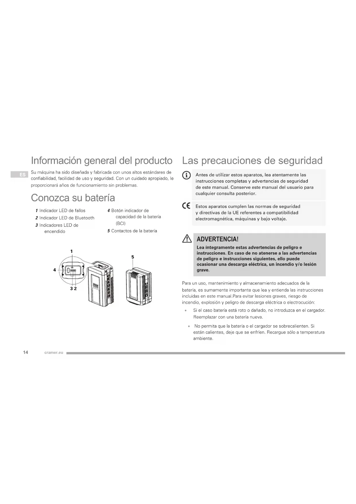Información general del producto Su máquina ha sido diseñada y fabricada con unos altos estándares de confiabilidad, facilidad de uso y seguridad. Con un cuidado apropiado, le proporcionará años de funcionamiento sin problemas. Conozca su batería 1 Indicador LED de fallos 2 Indicador LED de Bluetooth 3 Indicadores LED de encendido 4 Botón indicador de capacidad de la batería (BCI) 5 Contactos de la batería Las precauciones de seguridad Antes de utilizar estos aparatos, lea atentamente las instrucciones completas y advertencias de seguridad de este manual. Conserve este manual del usuario para cualquier consulta posterior. Estos aparatos cumplen las normas de seguridad y directivas de la UE referentes a compatibilidad electromagnética, máquinas y bajo voltaje. ADVERTENCIA! Lea íntegramente estas advertencias de peligro e instrucciones. En caso de no atenerse a las advertencias de peligro e instrucciones siguientes, ello puede ocasionar una descarga eléctrica, un incendio y/o lesión grave. Para un uso, mantenimiento y almacenamiento adecuados de la batería, es sumamente importante que lea y entienda las instrucciones incluidas en este manual.Para evitar lesiones graves, riesgo de incendio, explosión y peligro de descarga eléctrica o electrocución:
