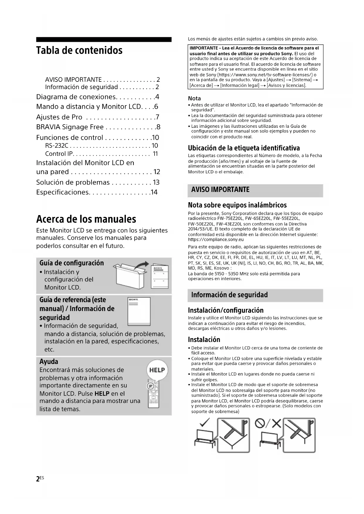 - Antes de utilizar el Monitor LCD, lea el apartado “Información de seguridad”.• Lea la documentación del seguridad suministrada para obtener información adicional sobre seguridad.• Las imágenes y las ilustraciones utilizadas en la Guía de configuración y este manual son solo ejemplos y pueden no coincidir con el producto real. Ubicación de la etiqueta identificativa Las etiquetas correspondientes al Número de modelo, a la Fecha de producción (año/mes) y al voltaje de la Fuente de alimentación se encuentran situadas en la parte posterior del Monitor LCD o el embalaje. Nota sobre equipos inalámbricos Por la presente, Sony Corporation declara que los tipos de equipo radioeléctrico FW-75EZ20L, FW-65EZ20L, FW-55EZ20L, FW-50EZ20L, FW-43EZ20L son conformes con la Directiva 2014/53/UE. El texto completo de la declaración UE de conformidad está disponible en la dirección Internet siguiente: https://compliance.sony.euPara este equipo de radio, aplican las siguientes restricciones de puesta en servicio o requisitos de autorización de uso en AT, BE, HR, CY, CZ, DK, EE, FI, FR, DE, EL, HU, IE, IT, LV, LT, LU, MT, NL, PL, PT, SK, SI, ES, SE, UK, UK (NI), IS, LI, NO, CH, BG, RO, TR, AL, BA, MK, MD, RS, ME, Kosovo :La banda de 5150 - 5350 MHz solo está permitida para operaciones en interiores. Instalación/configuración Instale y utilice el Monitor LCD siguiendo las instrucciones que se indican a continuación para evitar el riesgo de incendios, descargas eléctricas u otros daños y/o lesiones. Instalación