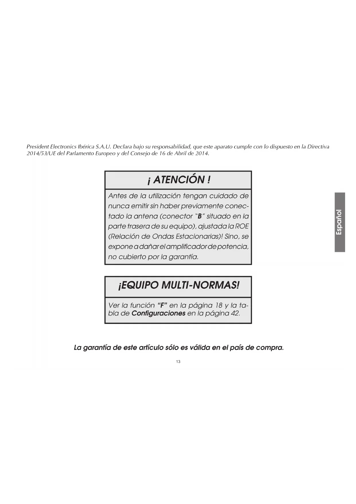- Dans le cas d’une intervention hors garantie, un devis sera établi avant toute réparation. Vous venez de faire confiance à la qualité et à l’expérience de PRESIDENT et nous vous remer- cions. Pour que vous soyez pleinement satisfait de votre achat, nous vous conseillons de lire attentivement ce manuel. N’oubliez pas de nous retourner la partie droite de ce bon de garantie, c’est très important pour vous car cela permet d’identifier votre appareil lors de son passage éventuel dans nos ateliers. Français13 La garantía de este artículo sólo es válida en el país de compra. ¡ ATENCIÓN ! ¡EQUIPO MULTI-NORMAS! Antes de la utilización tengan cuidado de nunca emitir sin haber previamente conec- tado la antena (conector “B” situado en la parte trasera de su equipo), ajustada la ROE (Relación de Ondas Estacionarias)! Sino, se expone a dañar el amplificador de potencia, no cubierto por la garantía. Ver la función “F” en la página 18 y la ta- bla de Configuraciones en la página 42. President Electronics Ibérica S.A.U. Declara bajo su responsabilidad, que este aparato cumple con lo dispuesto en la Directiva 2014/53/UE del Parlamento Europeo y del Consejo de 16 de Abril de 2014. Español14 Bienvenido al mundo de los emisores-receptores CB de última generación. Esta nueva gama de estaciones le permite acceder a la comunicación elec- trónica más competitiva. Gracias a la utilización de tecnología punta que garantiza una calidad sin precedentes, su PRESIDENT JIMMY III representa un nuevo hito en la facilidad de uso y la solución por excelencia para el usuario más exigente de CB. Para sacar el máximo partido de todas sus posibilidades, le aconsejamos leer atentamente estas instrucciones de uso antes de instalar y utilizar su CB PRESIDENT JIMMY III.