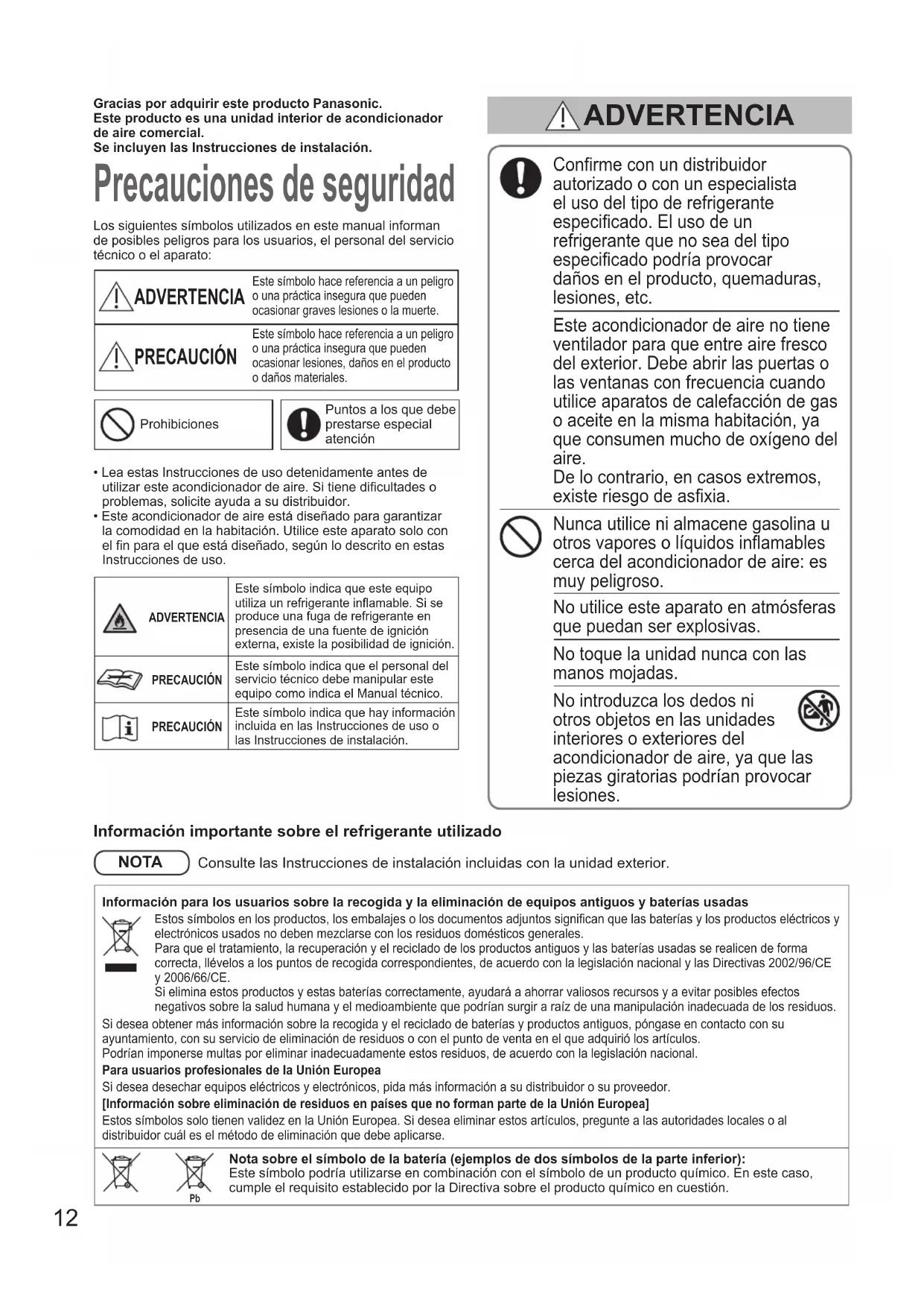 Témoin de ltreTélécommande câbléeTémoin de ltreEssuyez avec un chiffon doux.(En cas de saleté tenace, utilisez un chiffon imbibé d’eau.) OI_321286_EU.indb 11 2020/11/24 13:29:3712 Gracias por adquirir este producto Panasonic.Este producto es una unidad interior de acondicionador de aire comercial.Se incluyen las Instrucciones de instalación. Precauciones de seguridad Los siguientes símbolos utilizados en este manual informan de posibles peligros para los usuarios, el personal del servicio técnico o el aparato: ADVERTENCIA Este símbolo hace referencia a un peligro o una práctica insegura que pueden ocasionar graves lesiones o la muerte. PRECAUCIÓN Este símbolo hace referencia a un peligro o una práctica insegura que pueden ocasionar lesiones, daños en el producto o daños materiales.ProhibicionesPuntos a los que debe prestarse especial atención• Lea estas Instrucciones de uso detenidamente antes de utilizar este acondicionador de aire. Si tiene dicultades o problemas, solicite ayuda a su distribuidor.• Este acondicionador de aire está diseñado para garantizar la comodidad en la habitación. Utilice este aparato solo con el n para el que está diseñado, según lo descrito en estas Instrucciones de uso. Conrme con un distribuidor autorizado o con un especialista el uso del tipo de refrigerante especicado. El uso de un refrigerante que no sea del tipo especicado podría provocar daños en el producto, quemaduras, lesiones, etc. Este acondicionador de aire no tiene ventilador para que entre aire fresco del exterior. Debe abrir las puertas o las ventanas con frecuencia cuando utilice aparatos de calefacción de gas o aceite en la misma habitación, ya que consumen mucho de oxígeno del aire. De lo contrario, en casos extremos, existe riesgo de asxia. Nunca utilice ni almacene gasolina u otros vapores o líquidos inamables cerca del acondicionador de aire: es muy peligroso. No utilice este aparato en atmósferas que puedan ser explosivas. No toque la unidad nunca con las manos mojadas. No introduzca los dedos ni otros objetos en las unidades interiores o exteriores del acondicionador de aire, ya que las piezas giratorias podrían provocar lesiones. ADVERTENCIA ADVERTENCIAEste símbolo indica que este equipo utiliza un refrigerante inflamable. Si se produce una fuga de refrigerante en presencia de una fuente de ignición externa, existe la posibilidad de ignición.PRECAUCIÓNEste símbolo indica que el personal del servicio técnico debe manipular este equipo como indica el Manual técnico.PRECAUCIÓNEste símbolo indica que hay información incluida en las Instrucciones de uso o las Instrucciones de instalación.Información importante sobre el refrigerante utilizado NOTA Consulte las Instrucciones de instalación incluidas con la unidad exterior.Información para los usuarios sobre la recogida y la eliminación de equipos antiguos y baterías usadas