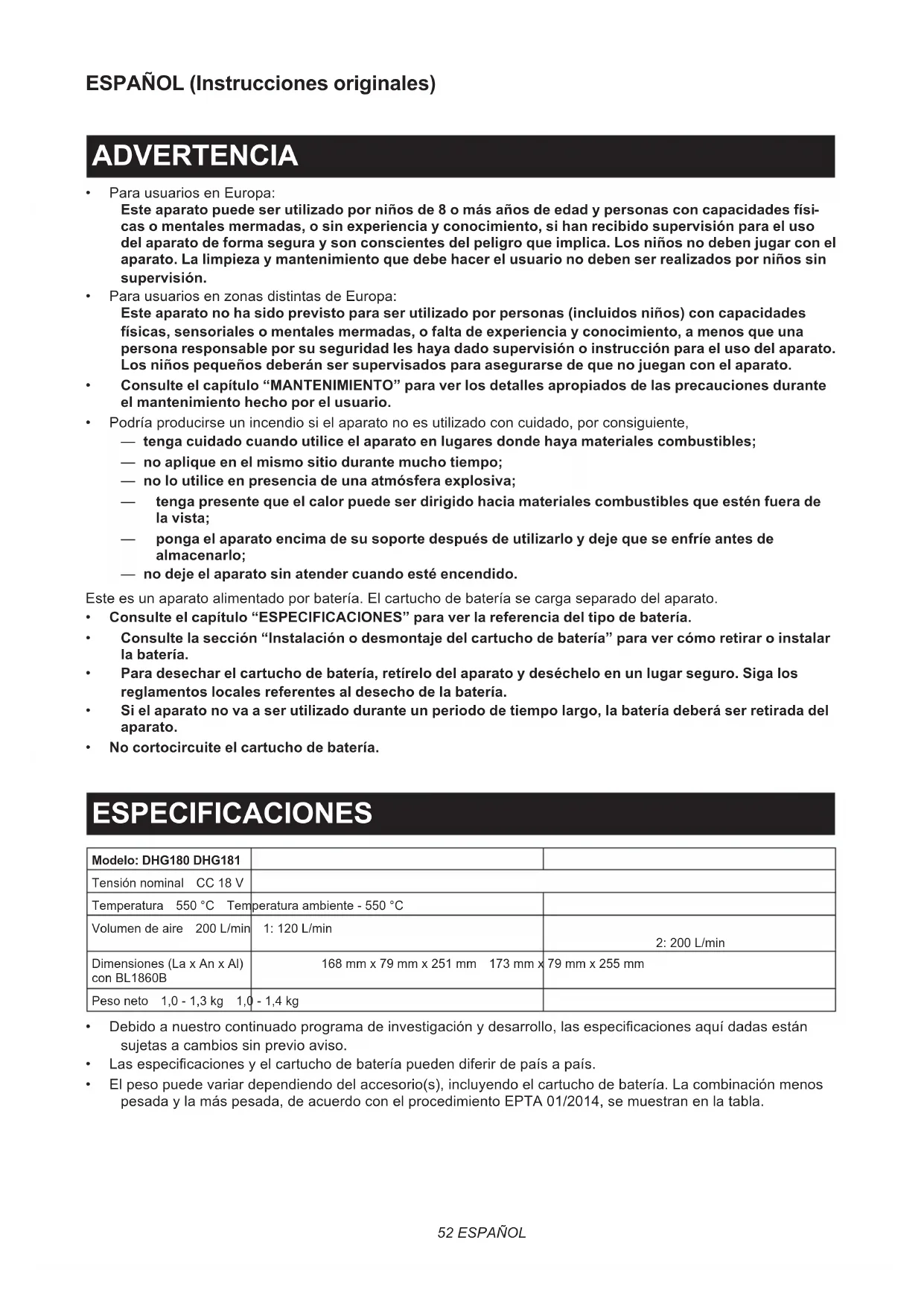 - No cortocircuite el cartucho de batería. ESPECIFICACIONES Modelo: DHG180 DHG181 Tensiónnominal CC18V Temperatura 550°C Temperaturaambiente-550°C Volumendeaire 200L/min 1:120L/min 2:200L/min Dimensiones(LaxAnxAl) conBL1860B 168mmx79mmx251mm 173mmx79mmx255mm Pesoneto 1,0-1,3kg 1,0-1,4kg