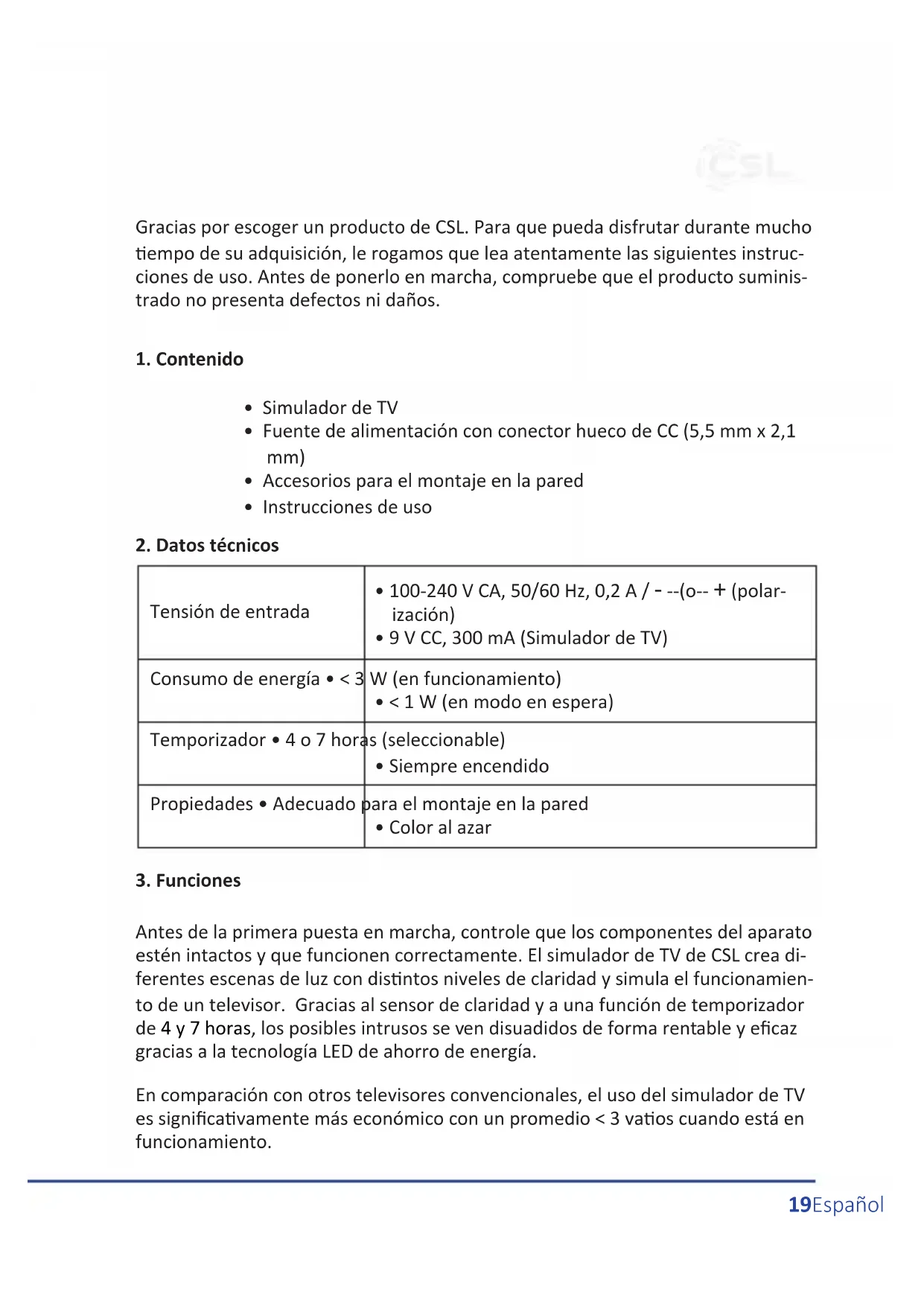 Antes de la primera puesta en marcha, controle que los componentes del aparato estén intactos y que funcionen correctamente. El simulador de TV de CSL crea diferentes escenas de luz con distintos niveles de claridad y simula el funcionamiento de un televisor. Gracias al sensor de claridad y a una función de temporizador de 4 y 7 horas, los posibles intrusos se ven disuadidos de forma rentable y eficaz gracias a la tecnología LED de ahorro de energía.