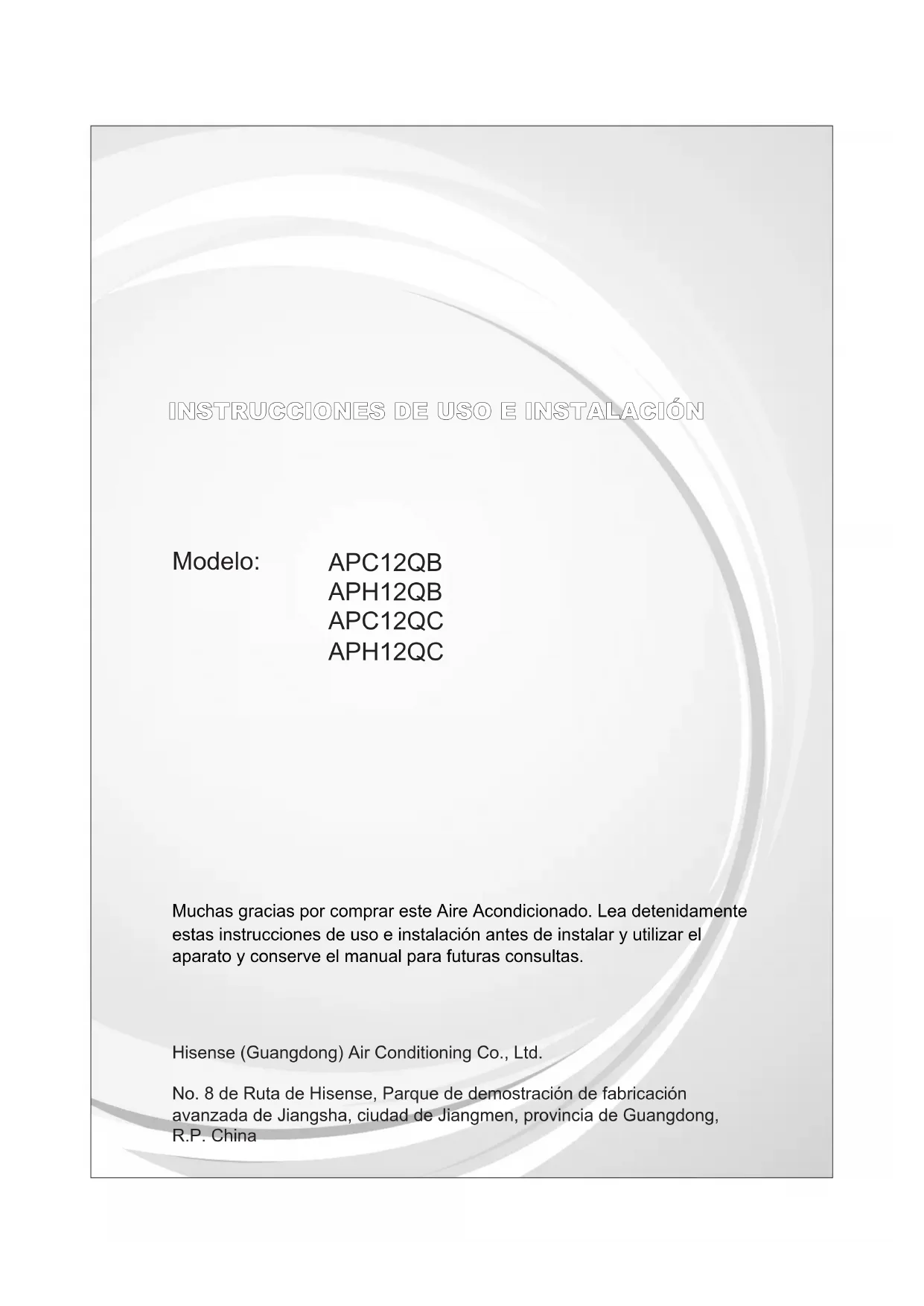 El filtro está sucio u obstruido por residuos. Limpie el filtro. El aire acondicionado funciona, pero no enfría La salida de aire está bloqueada. Despeje la salida de aire. El aire acondicionado se enciende y apaga demasiado El ajuste de temperatura es demasiado alto. Ajuste una temperatura más baja. El aire acondicionado no tiene un tamaño adecuado para la sala. Compruebe la capacidad de enfriamiento de su aire acondicionado portátil. Los aires acondicionados portátiles están diseñados como refrigeración complementaria en áreas locales de una sala. El filtro está sucio u obstruido por residuos. Limpie el filtro. Hay un calor o humedad excesivos en la sala (se está cocinando, duchas, etc.). Utilice un ventilador para extraer el calor o la humedad de la sala. Intente no utilizar aparatos que produzcan calor durante las horas más cálidas del día. Las rejillas están bloqueadas. Instale el aire acondicionado en un lugar donde las rejillas no estén obstruidas por cortinas, persianas, muebles, etc.Muito obrigado por comprar este equipamento de ar condicionado. Leia atentamente antes de usar este aparelho e mantenha-o para referência futura. Modelo: Hisense (Guangdong) Air Conditioning Co., Ltd. No.8 Hisense Road, Advanced Manufacturing Jiangsha Demonstration Park, Jiangmen City, Guangdong Province, P.R. China APC12QB APH12QB APC12QC APH12QC INSTRUÇÕES DE USO E INSTALAÇÃO1 ÍNDICE