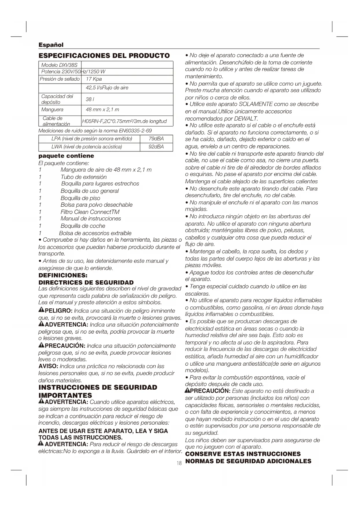 Descarga las instrucciones para tu Aspiradora industrial en formato PDF gratis! Encuentra tus instrucciones DXV38S - DEWALT y toma tu dispositivo electrónico nuevamente en la mano. En esta página están publicados todos los documentos necesarios para el uso de su dispositivo. DXV38S de la marca DEWALT.