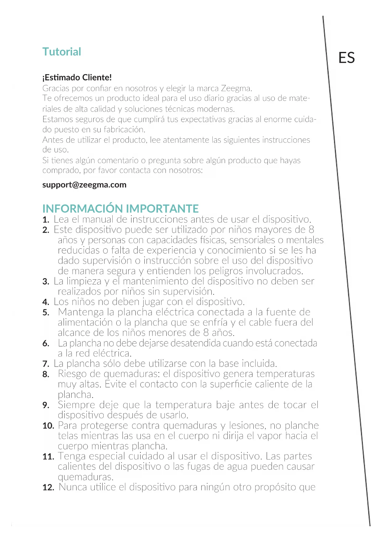 - En cas de repassage des ssus synthéques à température trop élevée, vous risquez d’abîmer votre ssu et de laisser des résidus de maère synthéque sur la semelle du fer à repasser. Pour enlever les résidus de maère synthéque, allumez l’appareil et repassez un morceau de ssu en coton. Les photos sont présentées à tre indicaf seulement, l’aspect réel des produits peut être diérent de celui présenté sur les photos.ES Tutorial ¡Esmado Cliente! Gracias por conar en nosotros y elegir la marca Zeegma. Te ofrecemos un producto ideal para el uso diario gracias al uso de mate- riales de alta calidad y soluciones técnicas modernas. Estamos seguros de que cumplirá tus expectavas gracias al enorme cuida- do puesto en su fabricación. Antes de ulizar el producto, lee atentamente las siguientes instrucciones de uso. Si enes algún comentario o pregunta sobre algún producto que hayas comprado, por favor contacta con nosotros: support@zeegma.com