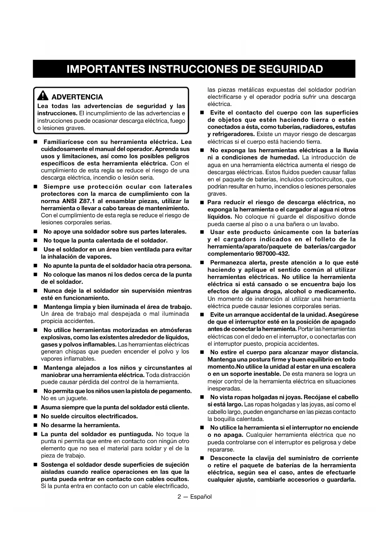 - Usar este producto únicamente con la baterías y el cargadores indicados en el folleto de la herr模板/apatato/paquete de baterías/cargador complementario 987000-432.