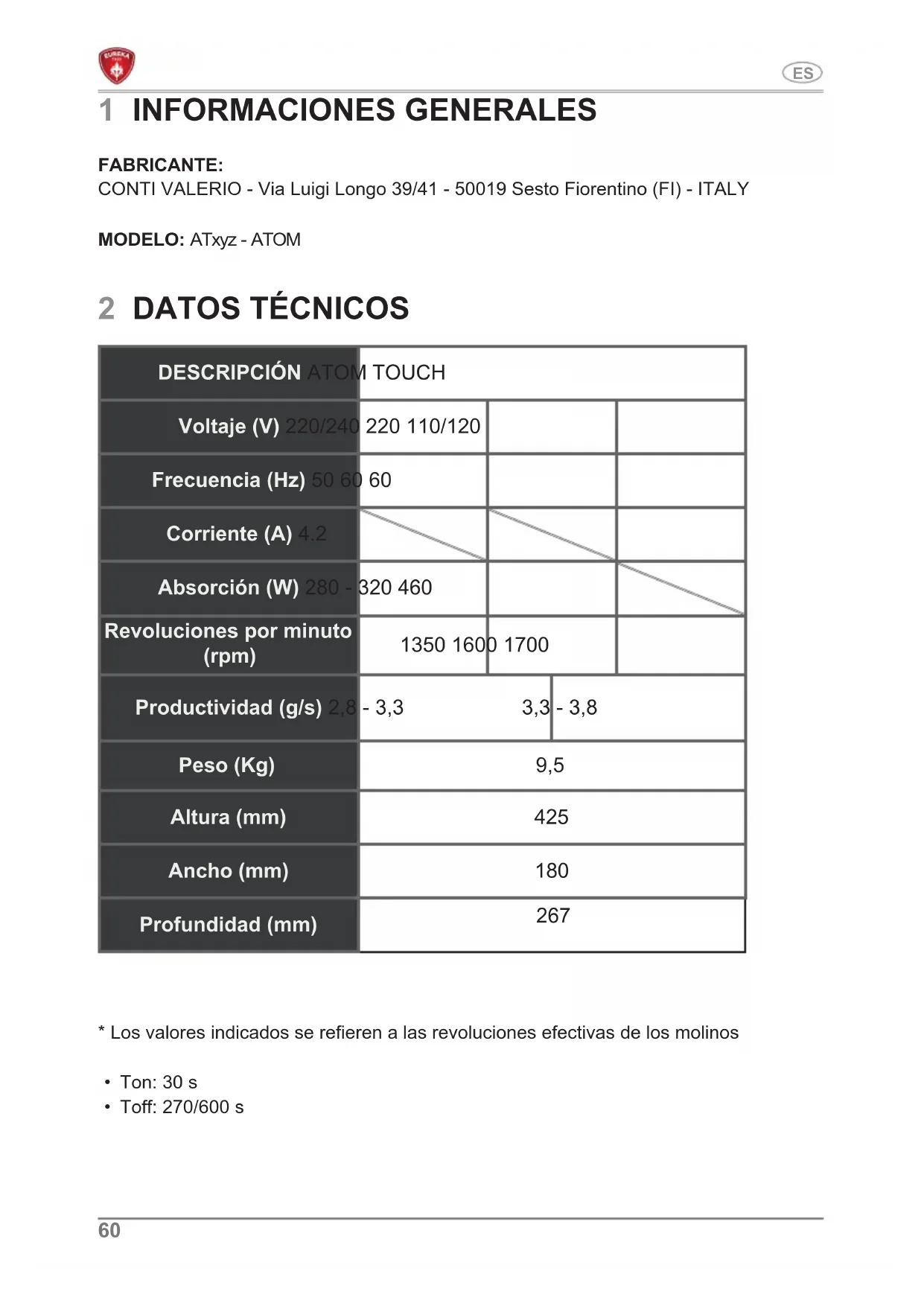 Productividad (g/s) 2,8 - 3,3 3,3 - 3,8 Peso (Kg) 9,5 Altura (mm) 425 Ancho (mm) 180 Profundidad (mm)