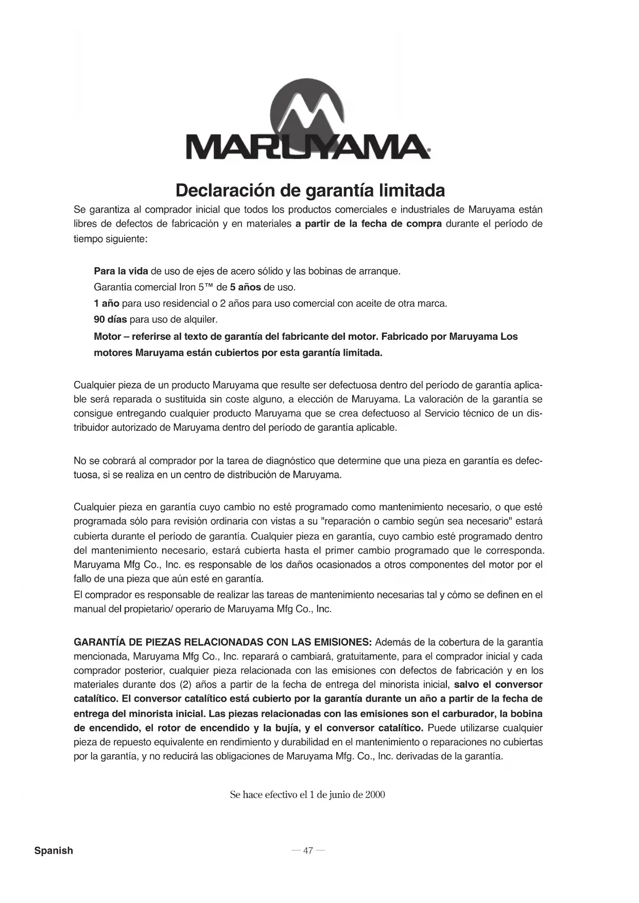 La Agencia de proteccion ambiental (EPA) obliga a los fabricantes de este tipo de motores a complir la normativa durante dos años. Estos periodos de garantia se iniciaan en la fecha en que el comprador inicial adquiera elklequeo motor no destined a la automocion. Si qualquier pieza del motor relacionada con las emisiones es defectuosa, Maruyama Manufacturing Company, Inc. la cambiara Gratisamente.