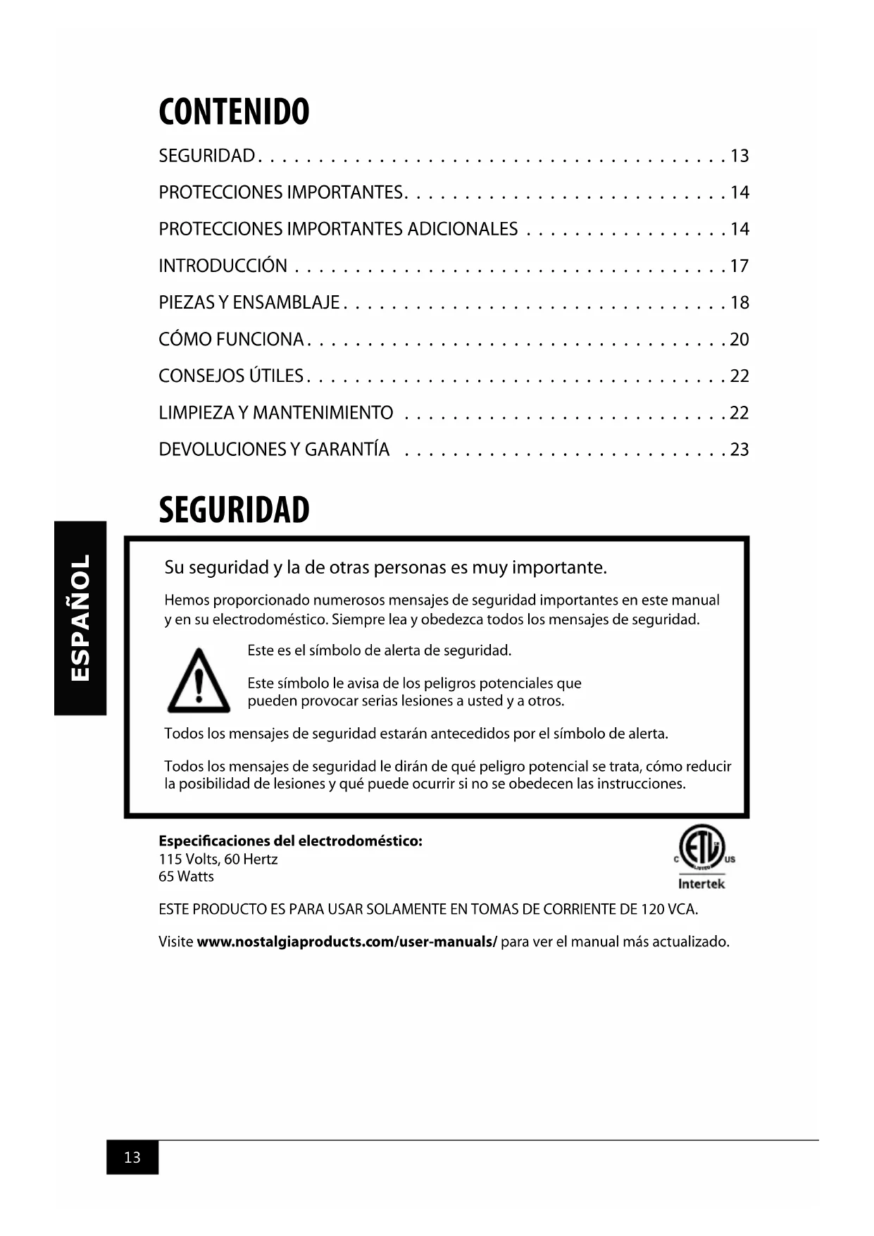 SEGURIDAD Especicaciones del electrodoméstico: 115 Volts, 60 Hertz 65 Watts ESTE PRODUCTO ES PARA USAR SOLAMENTE EN TOMAS DE CORRIENTE DE 120 VCA. Visite www.nostalgiaproducts.com/user-manuals/ para ver el manual más actualizado. Su seguridad y la de otras personas es muy importante. Hemos proporcionado numerosos mensajes de seguridad importantes en este manual y en su electrodoméstico. Siempre lea y obedezca todos los mensajes de seguridad. Este es el símbolo de alerta de seguridad. Este símbolo le avisa de los peligros potenciales que pueden provocar serias lesiones a usted y a otros. Todos los mensajes de seguridad estarán antecedidos por el símbolo de alerta. Todos los mensajes de seguridad le dirán de qué peligro potencial se trata, cómo reducir la posibilidad de lesiones y qué puede ocurrir si no se obedecen las instrucciones.14 ESPAÑOL