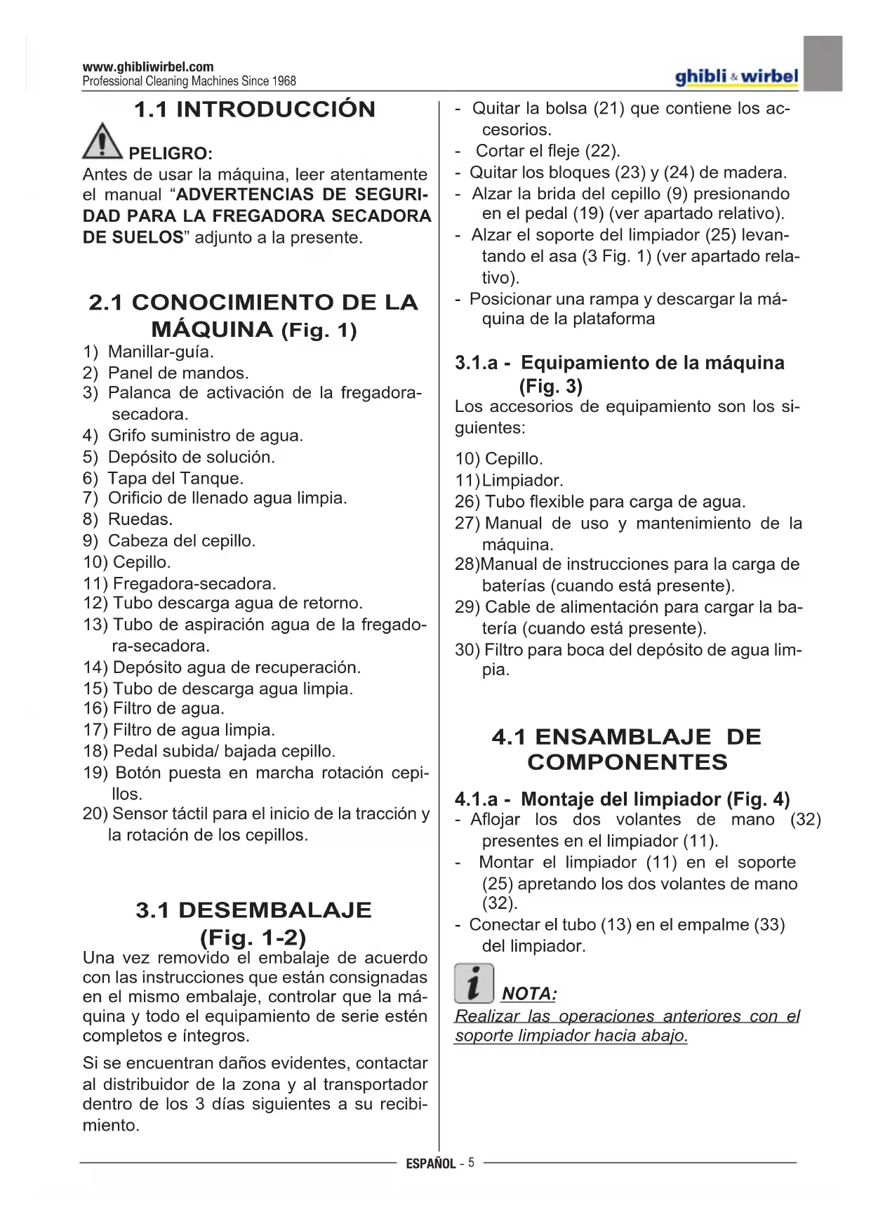 (Fig. 1-2) Una vez removido el embalaje de acuerdo con las instrucciones que están consignadas en el mismo embalaje, controlar que la má- quina y todo el equipamiento de serie estén completos e íntegros. Si se encuentran daños evidentes, contactar al distribuidor de la zona y al transportador dentro de los 3 días siguientes a su recibi- miento. - Quitar la bolsa (21) que contiene los ac- cesorios. - Cortareleje(22). - Quitar los bloques (23) y (24) de madera. - Alzar la brida del cepillo (9) presionando en el pedal (19) (ver apartado relativo). - Alzar el soporte del limpiador (25) levan- tando el asa (3 Fig. 1) (ver apartado rela- tivo). - Posicionar una rampa y descargar la má- quina de la plataforma