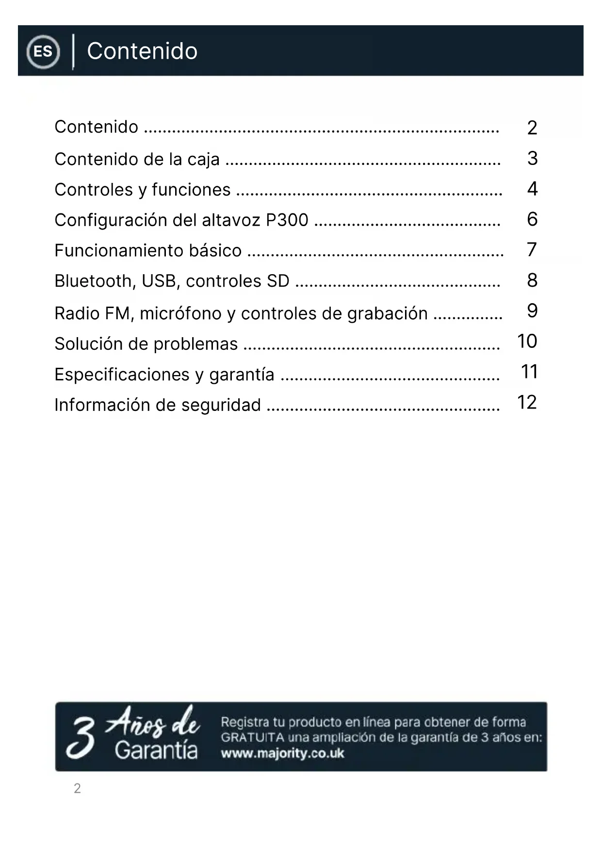 Solución de problemasEspecificaciones y garantía Especificación Fuente de alimentación 100 240V – 50 – 60Hz Modo: BluetoothEntrada AUX de 3,5 mmLector USBLector SDRadio FM Consumo de energía 0,5 W (modo de espera) Dimensiones 255 × 255 × 565 mmPeso 4.40 kgAltavoces 2*6.5” Woofer + tweeterVersión Bluetooth 5.0Alcance del Bluetooth Up to 10 meters Tipos de archivo compatibles MP3, WMA. SBC, WAV, FLAC Máximo almacenamiento USB/SD compatible 64GB Garantía Todos los productos tienen una garantía estándar de 12 meses. Todos los artículos deben registrarse en www.majority.co.uk para que la garantía sea válida. Una vez en la página web, utilice el menú para encontrar "Registre su producto". También tendrá la posibilidad de ampliar la garantía 24 meses más, sin coste alguno.