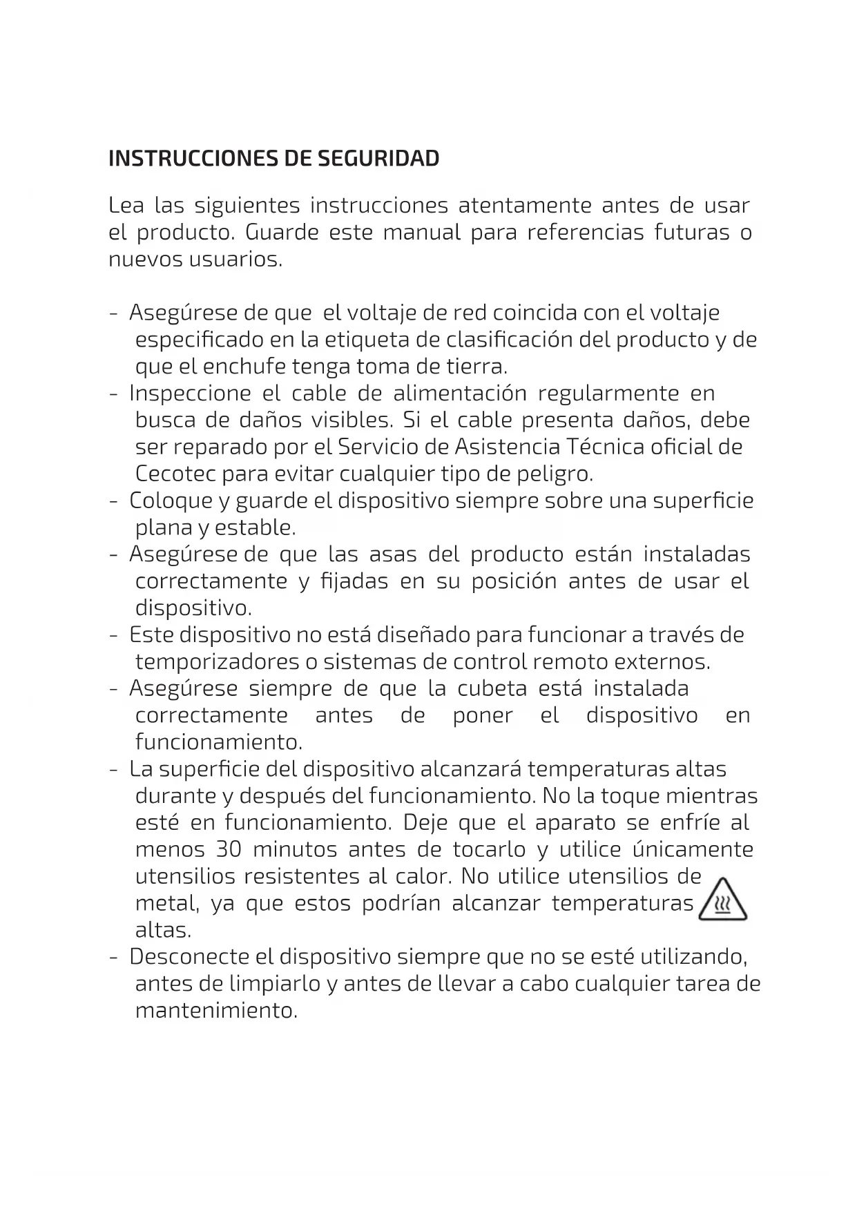 - Saque el producto de la caja y retire todo el material de embalaje. - Asegúrese de que todas las piezas y componentes están incluidas y en buen estado. Si se observara algún daño visible o faltara alguna de las partes, contacte de forma inmediata con el Servicio de Atención Técnica ocial de Cecotec. - Limpie el dispositivo a fondo antes de usarlo por primera vez. - Abra la tapa. - Retire el cesto. - Limpie la parte interior de la tapa, del cesto y de la cubeta de aceite con un trapo húmedo y séquelo cuidadosamente. - Limpie todos los accesorios y la cubeta con agua tibia. Séquelos bien antes de usar. Asegúrese de que todas las partes eléctricas están secas. - Asegúrese de que el dispositivo está apagado antes de desconectarlo de la toma de corriente.CLEANFRY LUXURY 4000/BLACK/DARK