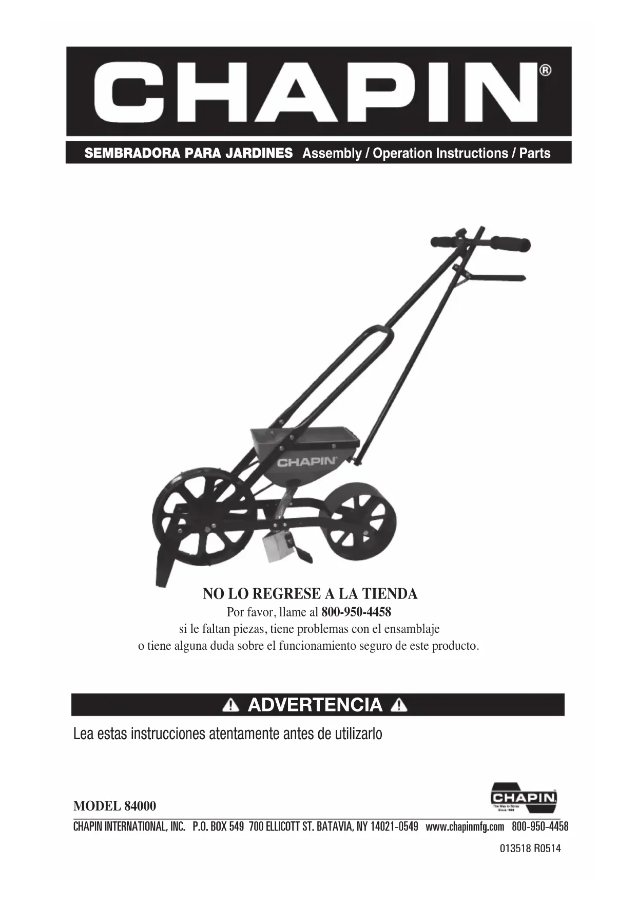 tion and compliance with the terms of this warranty. All returned product must first receive authorization from Chapin by phone at 800-950-4458 or mail at 700 Ellicott Street, Batavia, New York, 14021. LIMITACIONES: Esta garantía cubre solo el producto. Se excluye específicamente todo gasto adicional asociado con la reparación o el reemplazo del producto defectuoso. Chapin no ofrece garantía contra la falla de un producto debido a los efectos de corrosión. Como una medida preventiva, limpie y seque completamente su esparcidor después de cada uso. 1 años de garantía limitada Chapin garantiza este producto contra defectos en la calidad y los materiales por un periodo de 2 años. Si se encuentra un defecto durante este periodo, Chapin reparará o reemplazará el producto sin ningún cargo siempre y cuando la falla no sea el resultado de una incorrecta instalación, un mal manejo o un desgaste normal, según sea determinado por Chapin. Es posible que Chapin solicite el regreso del producto junto con el recibo original de la compra para su revisión y conformidad con los términos de esta garantía. Todo producto regresado debe primero tener la autorización de Chapin por teléfono al 800-950-4458 o por correo a 700 Ellicott Street, Batavia, New York, 14021. LIMITATIONS : Cette garantie couvre uniquement le produit. Toute dépense supplémentaire as