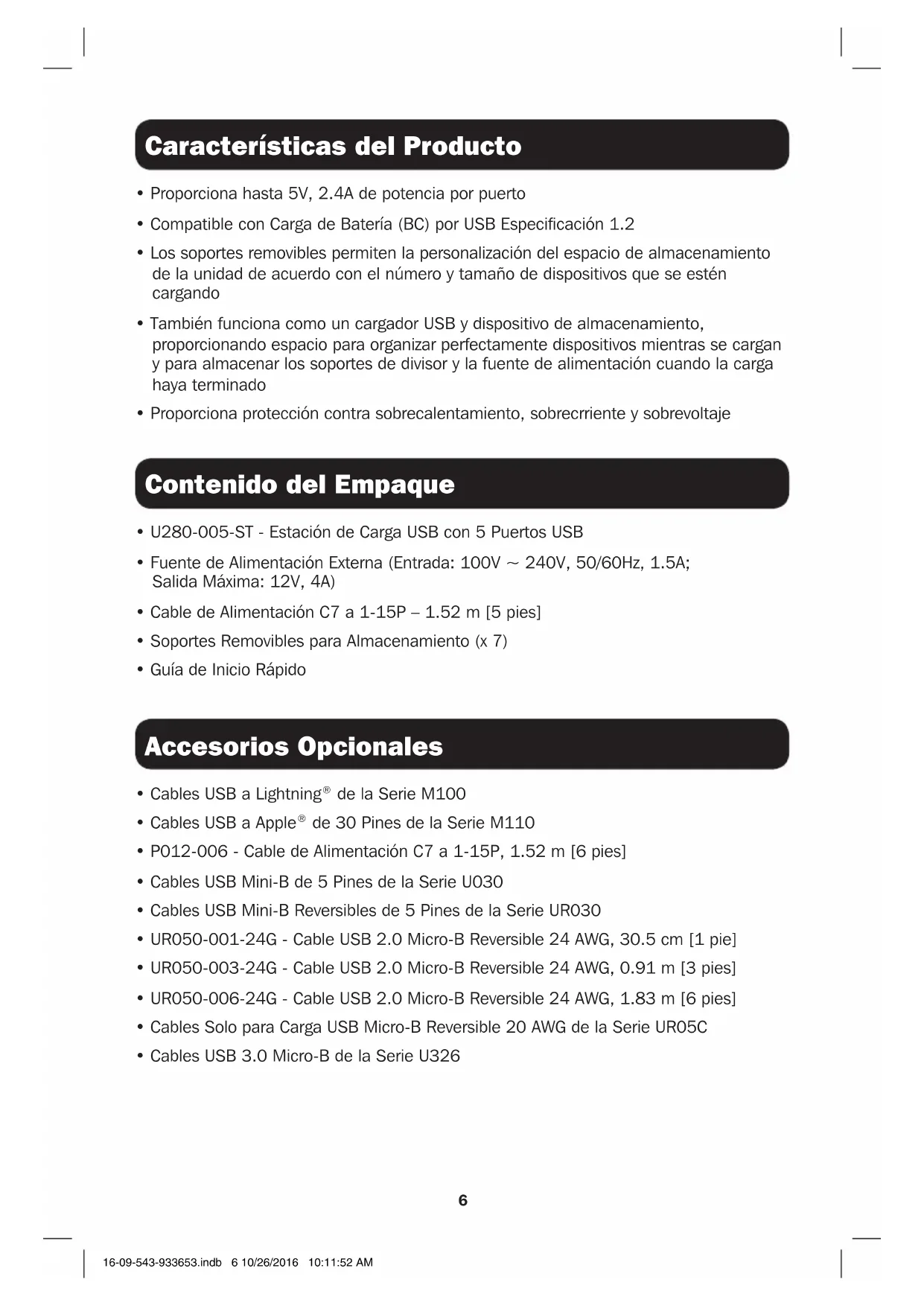 Para carregar dispositivos USB, simplemente connecte la fuente de alimentacion externa y los cables de alimentacion incluidos al U280-005-ST y a una fuente de alimentacion,對於 ENCHUFE LOS DISPOSITivos EN LOS puertos disponibles. Los cinco puertos USB-A proportionscen un maximum de 5V, 2.4A de potencia.