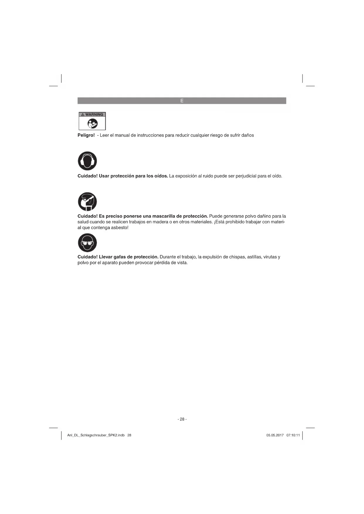 Peligro! - Leer el manual de instrucciones para reducir cualquier riesgo de sufrir daños Cuidado! Usar protección para los oídos. La exposición al ruido puede ser perjudicial para el oído. Cuidado! Llevar gafas de protección. Durante el trabajo, la expulsión de chispas, astillas, virutas y polvo por el aparato pueden provocar pérdida de vista. Cuidado! Es preciso ponerse una mascarilla de protección. Puede generarse polvo dañino para la salud cuando se realicen trabajos en madera o en otros materiales. ¡Está prohibido trabajar con materi- al que contenga asbesto! Anl_DL_Schlagschrauber_SPK2.indb 28Anl_DL_Schlagschrauber_SPK2.indb 28 05.05.2017 07:10:1105.05.2017 07:10:11E
