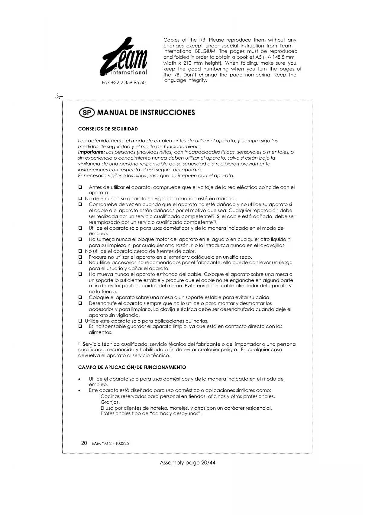 Utilice el aparato sólo para usos domésticos y de la manera indicada en el modo de empleo. Este aparato está diseñado para uso doméstico o aplicaciones similares como: Cocinas reservadas para personal en tiendas, oficinas y otros profesionales. Granjas. El uso por clientes de hoteles, moteles, y otros con un carácter residencial. Profesionales tipo de “camas y desayunos”. Copies of the I/B. Please reproduce them without any changes except under special instruction from Team International BELGIUM. The pages must be reproduced and folded in order to obtain a booklet A5 (+/- 148.5 mm width x 210 mm height). When folding, make sure you keep the good numbering when you turn the pages of the I/B. Don’t change the page numbering. Keep the language integrity.