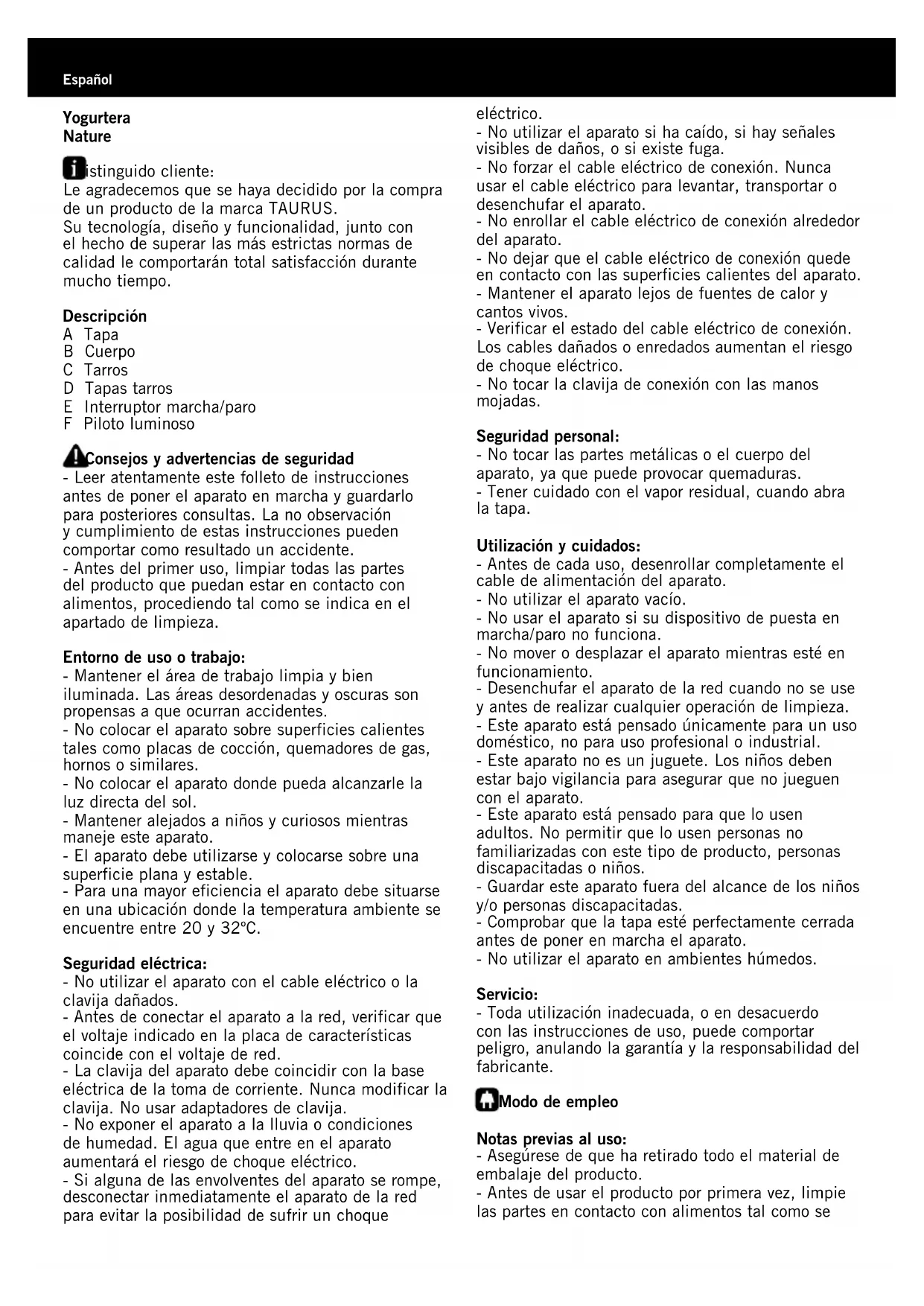 FEspañol Yogurtera Nature Distinguido cliente: Le agradecemos que se haya decidido por la compra de un producto de la marca TAURUS. Su tecnología, diseño y funcionalidad, junto con el hecho de superar las más estrictas normas de calidad le comportarán total satisfacción durante mucho tiempo. Descripción A Tapa B Cuerpo C Tarros D Tapas tarros E Interruptor marcha/paro F Piloto luminoso Consejosyadvertenciasdeseguridad - Leer atentamente este folleto de instrucciones antes de poner el aparato en marcha y guardarlo para posteriores consultas. La no observación y cumplimiento de estas instrucciones pueden comportar como resultado un accidente. - Antes del primer uso, limpiar todas las partes del producto que puedan estar en contacto con alimentos, procediendo tal como se indica en el apartado de limpieza. Entornodeusootrabajo: - Mantener el área de trabajo limpia y bien iluminada. Las áreas desordenadas y oscuras son propensas a que ocurran accidentes. - No colocar el aparato sobre superficies calientes tales como placas de cocción, quemadores de gas, hornos o similares. - No colocar el aparato donde pueda alcanzarle la luz directa del sol. - Mantener alejados a niños y curiosos mientras maneje este aparato. - El aparato debe utilizarse y colocarse sobre una superficie plana y estable. - Para una mayor eficiencia el aparato debe situarse en una ubicación donde la temperatura ambiente se encuentre entre 20 y 32ºC. Seguridadeléctrica: - No utilizar el aparato con el cable eléctrico o la clavija dañados. - Antes de conectar el aparato a la red, verificar que el voltaje indicado en la placa de características coincide con el voltaje de red. - La clavija del aparato debe coincidir con la base eléctrica de la toma de corriente. Nunca modificar la clavija. No usar adaptadores de clavija. - No exponer el aparato a la lluvia o condiciones de humedad. El agua que entre en el aparato aumentará el riesgo de choque eléctrico. - Si alguna de las envolventes del aparato se rompe, desconectar inmediatamente el aparato de la red para evitar la posibilidad de sufrir un choque eléctrico. - No utilizar el aparato si ha caído, si hay señales visibles de daños, o si existe fuga. - No forzar el cable eléctrico de conexión. Nunca usar el cable eléctrico para levantar, transportar o desenchufar el aparato. - No enrollar el cable eléctrico de conexión alrededor del aparato. - No dejar que el cable eléctrico de conexión quede en contacto con las superficies calientes del aparato. - Mantener el aparato lejos de fuentes de calor y cantos vivos. - Verificar el estado del cable eléctrico de conexión. Los cables dañados o enredados aumentan el riesgo de choque eléctrico. - No tocar la clavija de conexión con las manos mojadas. Seguridadpersonal: - No tocar las partes metálicas o el cuerpo del aparato, ya que puede provocar quemaduras. - Tener cuidado con el vapor residual, cuando abra la tapa. Utilizaciónycuidados: - Antes de cada uso, desenrollar completamente el cable de alimentación del aparato. - No utilizar el aparato vacío. - No usar el aparato si su dispositivo de puesta en marcha/paro no funciona. - No mover o desplazar el aparato mientras esté en funcionamiento. - Desenchufar el aparato de la red cuando no se use y antes de realizar cualquier operación de limpieza. - Este aparato está pensado únicamente para un uso doméstico, no para uso profesional o industrial. - Este aparato no es un juguete. Los niños deben estar bajo vigilancia para asegurar que no jueguen con el aparato. - Este aparato está pensado para que lo usen adultos. No permitir que lo usen personas no familiarizadas con este tipo de producto, personas discapacitadas o niños. - Guardar este aparato fuera del alcance de los niños y/o personas discapacitadas. - Comprobar que la tapa esté perfectamente cerrada antes de poner en marcha el aparato. - No utilizar el aparato en ambientes húmedos. Servicio: - Toda utilización inadecuada, o en desacuerdo con las instrucciones de uso, puede comportar peligro, anulando la garantía y la responsabilidad del fabricante. Mododeempleo Notaspreviasaluso: - Asegúrese de que ha retirado todo el material de embalaje del producto. - Antes de usar el producto por primera vez, limpie las partes en contacto con alimentos tal como sedescribe en el apartado de Limpieza. - Para preparar los yogures va a necesitar un litro de leche y fermento *Eleccióndelaleche: - Elegir preferentemente leche entera o semidesnatada (leche UHT de larga conservación o en polvo). Esta leche no necesita ser hervida antes de su utilización. No utilizar leche desnatada. - La leche entera proporciona más fermentos y aromas. - Las leches frescas o pasteurizadas se deben hervir previamente, dejarse enfriar y posteriormente retirar la nata. Estas leches contienen más vitaminas y oligoelementos. - Para obtener yogures más consistentes añadir 2 o 3 cucharadas soperas de leche en polvo. - Utilizar la leche a temperatura ambiente o ligeramente caliente (37º - 40º). *Eleccióndelfermento. Escoger: A - Utilizar un yogurt (preferentemente de leche entera) con una fecha de caducidad lo más tardía posible. B - Utilizar un fermento seco liofilizado (se adquiere en grandes superficies, farmacias o tiendas especializadas). En este caso respetar el tiempo de activación recomendado en el folleto del fermento. C - Utilizar un yogurt elaborado por usted mismo. En este caso no usar más de 5 veces. *Preparacióndelyogurt - Mezclar cuidadosamente un litro de leche con el fermento. Para obtener una buena mezcla, bata el yogurt hasta obtener una masa lisa y añada a continuación la leche mientras continúa mezclando. Evitar hacer espuma. Puestaenmarchadelamaquina: - Desenrollar completamente el cable antes de enchufar. - Enchufar el aparato a la red eléctrica. - Retirar la tapa protectora (A). - Introduzca la mezcla en los tarros (C) - Colocar los tarros (C), sin su tapa (D), en la yogurtera. - Colocar la 